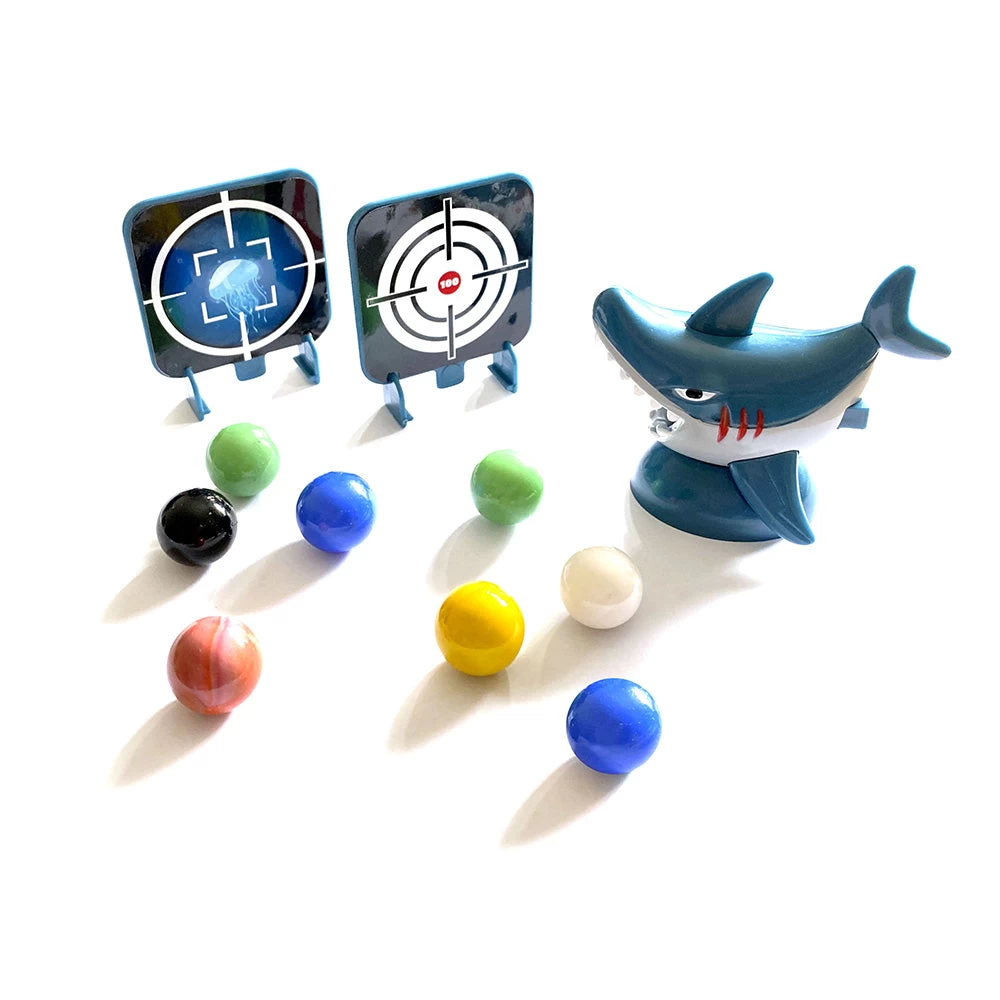 - Place a marble in the shark’s jaw.