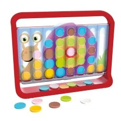 - Colour game – Insert the sheet behind the grid, and reproduce the pattern using the coloured tokens. To start again or to reproduce a new sheet, open the compartment at the bottom of the grid to make the tokens fall.