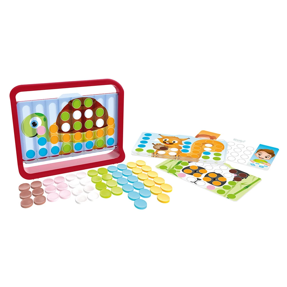- The kit includes a lot of accessories, including 15 designs to reproduce, 1 game grid, 50 tokens of 6 different colours.
