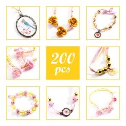 A pretty selection of coloured beads and floral accessories. Contains 4 boxes of beads, 1 reel with 5 different coloured ribbons and elastics, 1 illustrated locket with coloured chain, 2 small illustrated lockets, a range of small accessories and booklet. Skill Development: dexterity, hand-eye coordination, art appreciation, patience and concentration, creativity and imagination