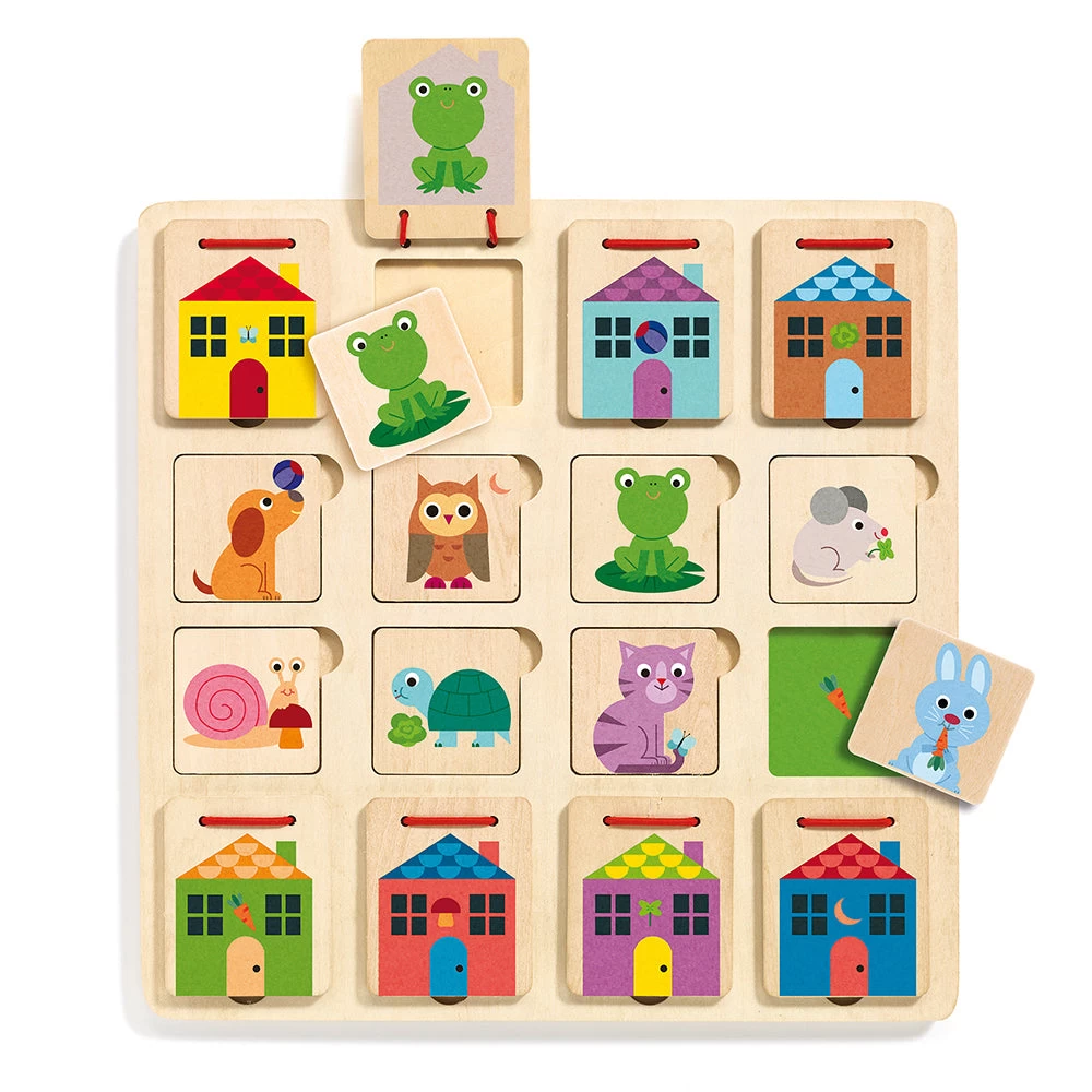 A sweet wooden puzzle hide and seek game with fun challenges. Skill Development: fine motor skills, shape recognition, color matching, visual acuity and cognitive development?C
