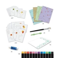 A lovely and colourful gel pastels art set. Children can colour animals and shapes, then press out to stick on beautiful backgrounds. Set comes with 4 illustrated background sheets, lots of shapes and animals to colour and press out, 12 gel pastels, one scratching tool, one glue stick and full colour step-by-step guide. Designed by Peggy Nille. Skill Development: dexterity, hand-eye coordination, art appreciation, patience and concentration, creativity and imagination