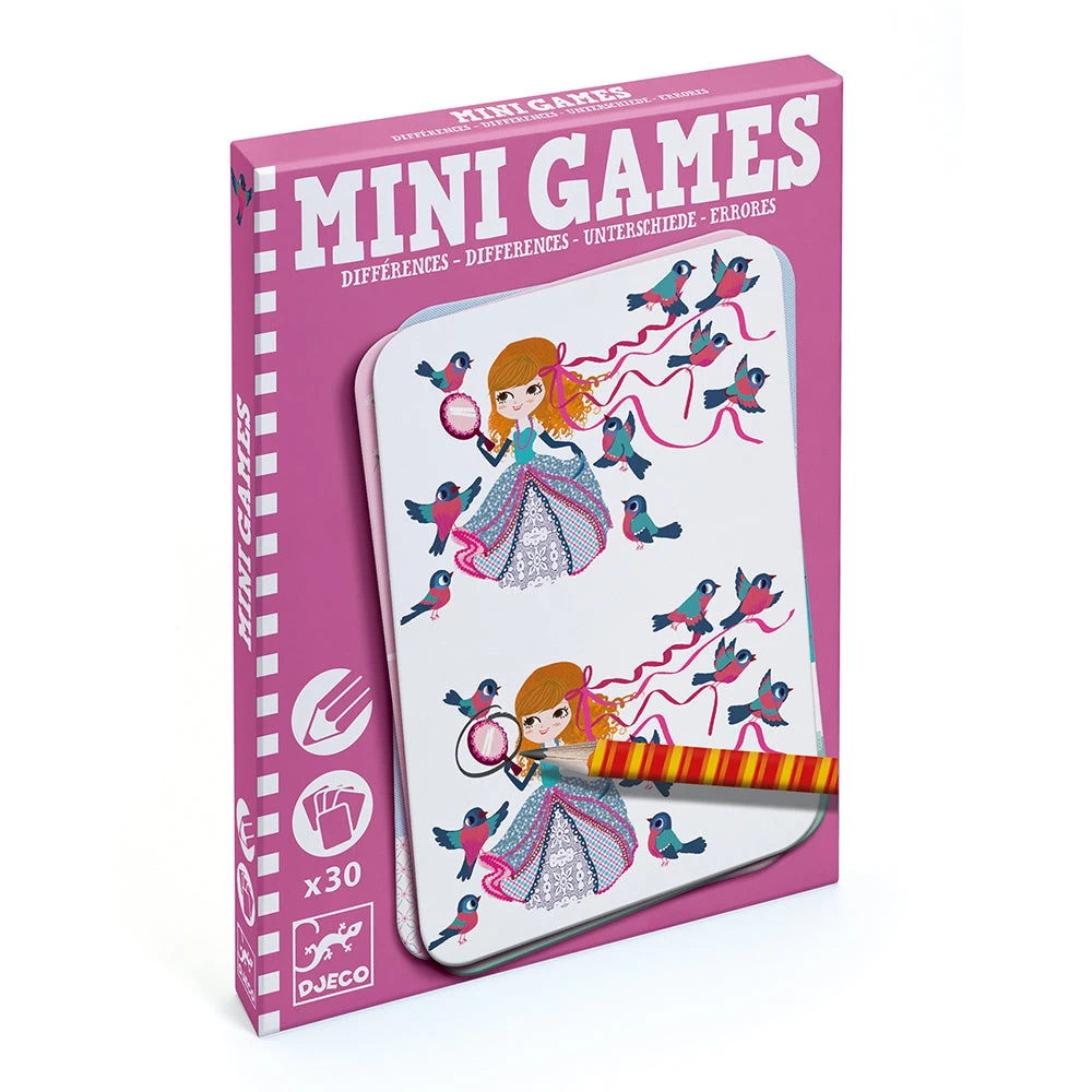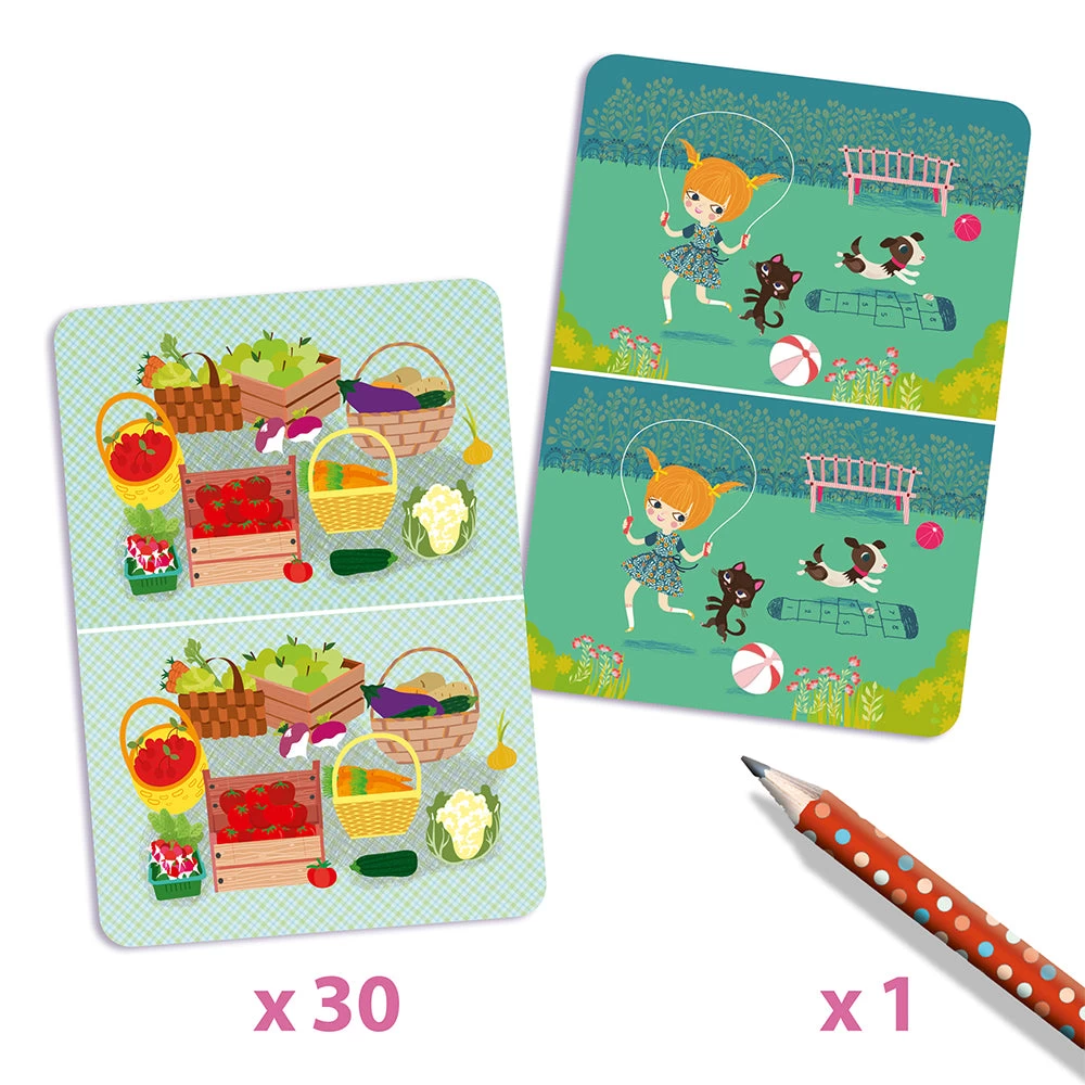 Try to spot the 7 differences between two pictures! Perfect size for taking on a trip. Includes a pencil and 30 spot the difference cards. Skill Development: observations and memory, concentration and dexterity.