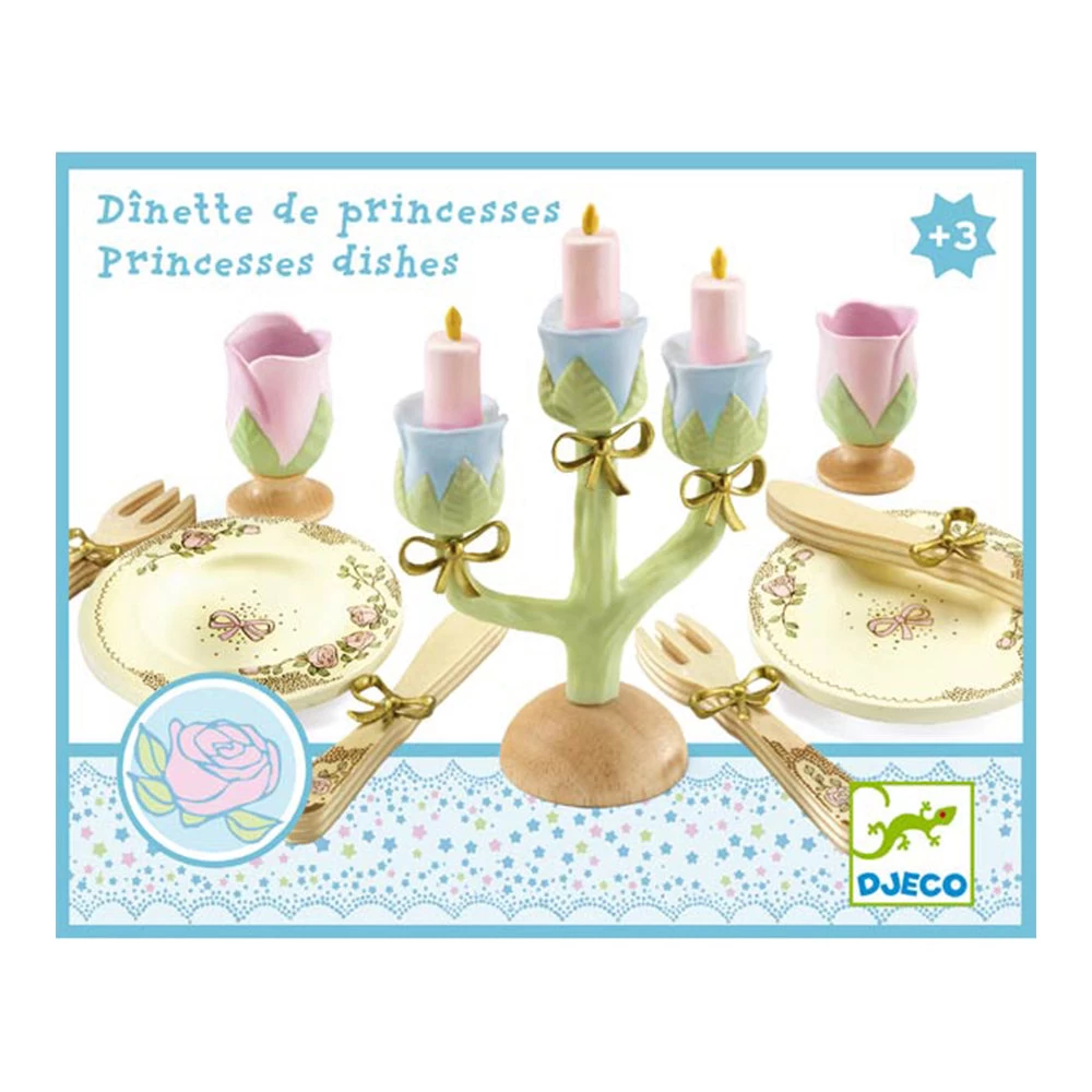 This gorgeous Princess Dining set is perfect for little ones who love to pretend! The wooden tableware set is fit for any special occasion and includes 2 decorative plates, 2 sets of knives and forks, 2 flower cups and candle holder! Designed by Virginie Brachet. Skill Development: fine motor skills, storytelling and role playing, creativity and imagination, visual acuity and cognitive development, social communication.