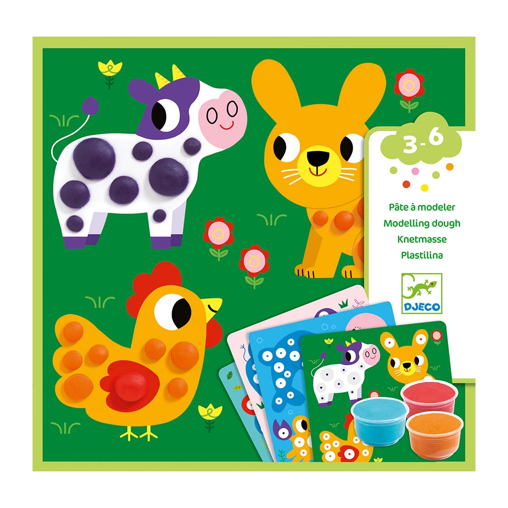 Decorate the animal pictures with colourful dough. The box contains 4 pictures to complete and 6 x 25g of coloured modelling dough. Designed by Marion Billet. Skill Development: dexterity, hand-eye coordination, shape recognition, patience and concentration, creativity and imagination