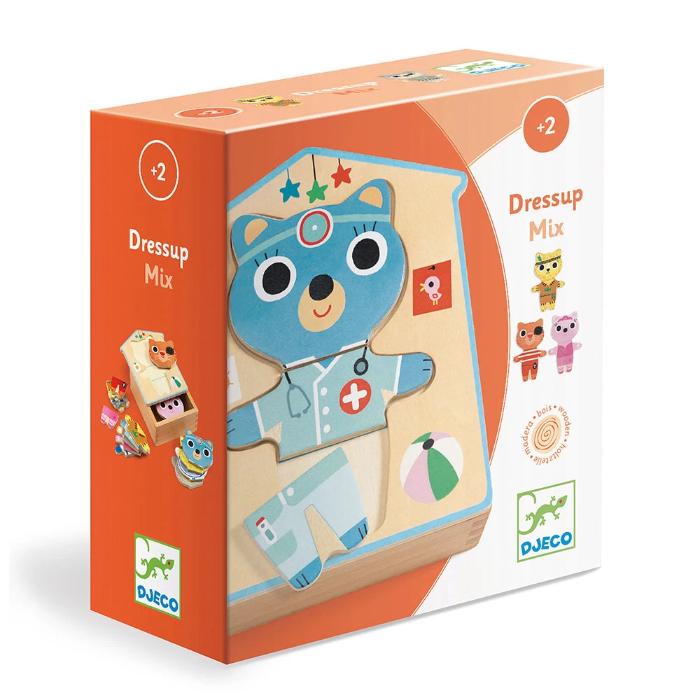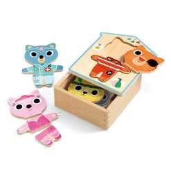 A cute wooden puzzle sets to recreate the 6 differently dresses animals. Skill Development: manual dexterity, eye-hand coordination, creativity and imagination, spatial reasoning, logical thinking, tactile learning