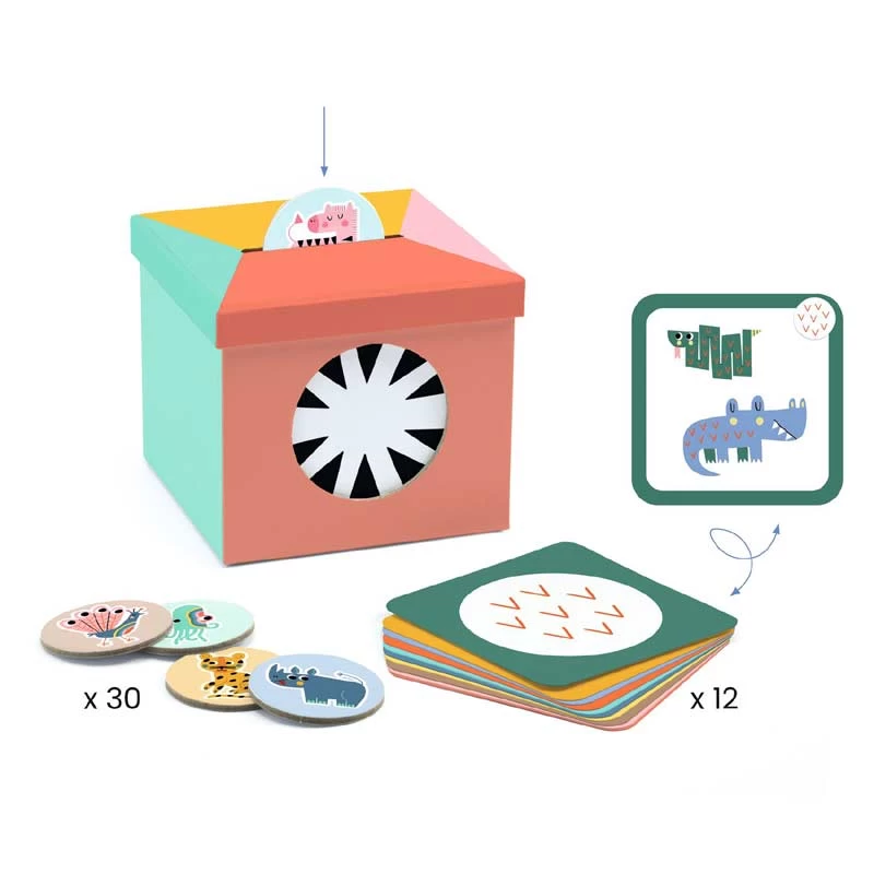 Contents: 12 criteria cards and 30 large tokens. Box with a slot for playing the game.