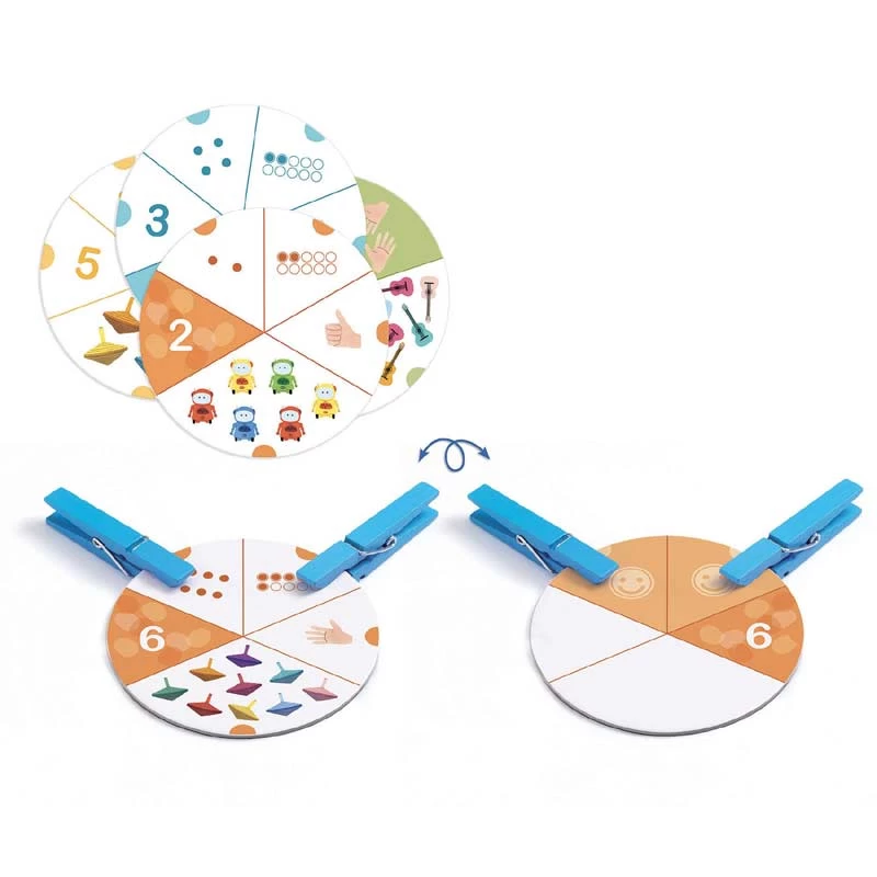 A game to deepen their knowledge of numbers and quantities. Uses the different representations found in school. A very simple and fun game thanks to the addition of clips. Self-correction: they turn the card over and immediately see if the answers are correct.