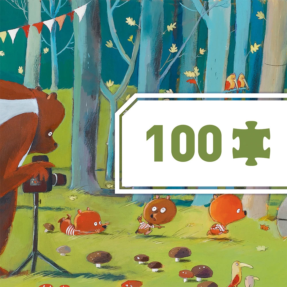 This fascinating large 100 piece puzzle depicts a pretty forest scene with animals all arranged to have their photograph taken by the bear. The pack comes with a free poster. Skill Development: fine motor skills, observation skills, sequencing, problem solving skill, visual acuity and cognitive development.