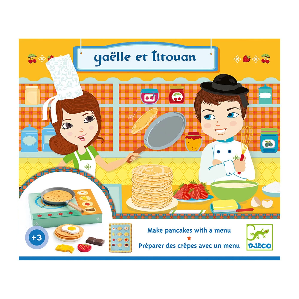 A lovely play food set for little ones to set up a tasty sweet or savoury treat. The solid wood storage box is decorated as a serving counter, open it up and serve up a selection of egg, cheese, strawberry or chocolate. pancakes. Skill Development: fine motor skills, storytelling and role playing, creativity and imagination, visual acuity and cognitive development, social communication.