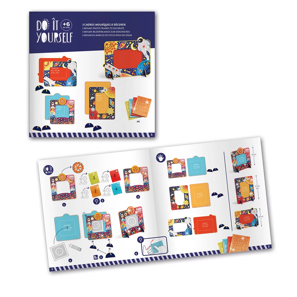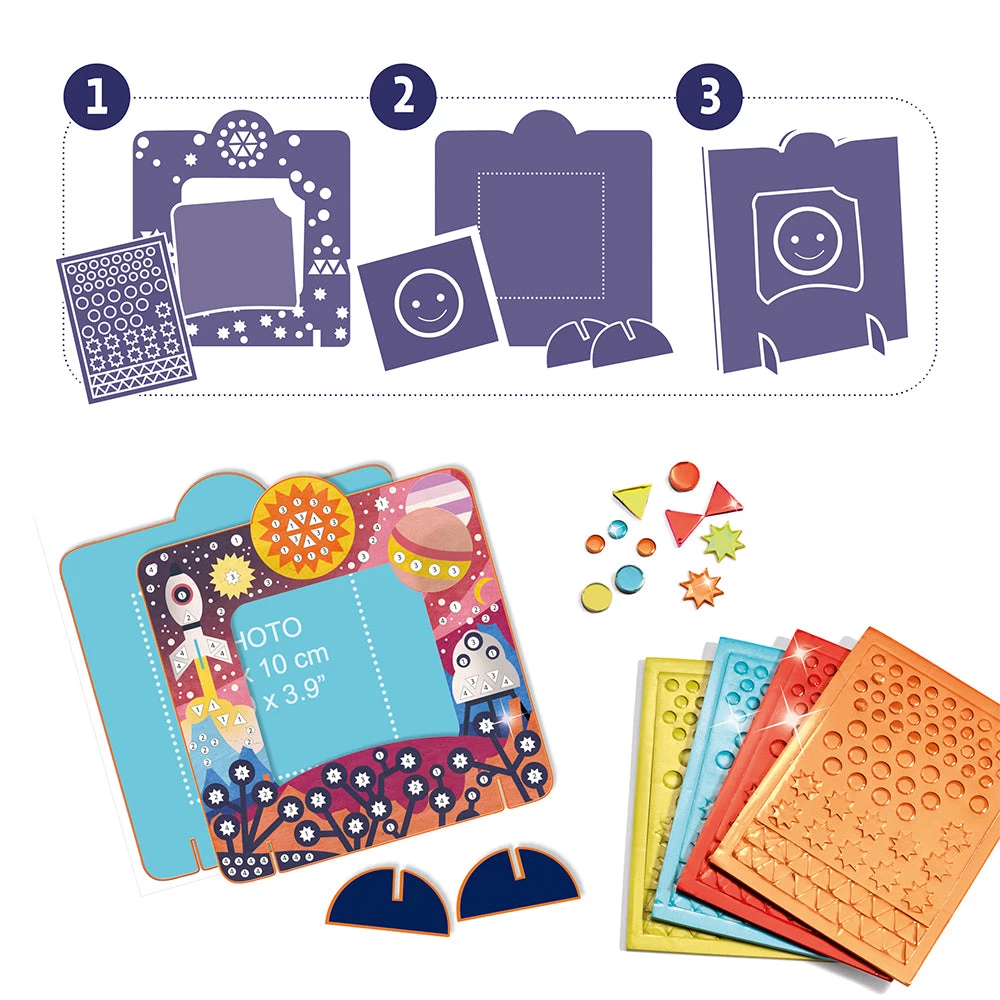 Create 3 out of this world space themed photo frames yourself ! Children will love decorating the 3 photo frames with the frame and self adhesive metallic mosaic pieces provided. Designed by R?gis Lejonc. Skill Development: dexterity, hand-eye coordination, colour and shape recognition, patience and concentration, creativity and imagination