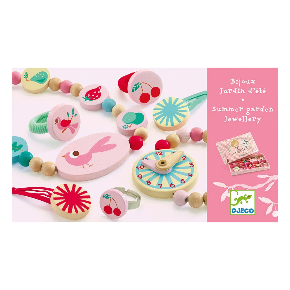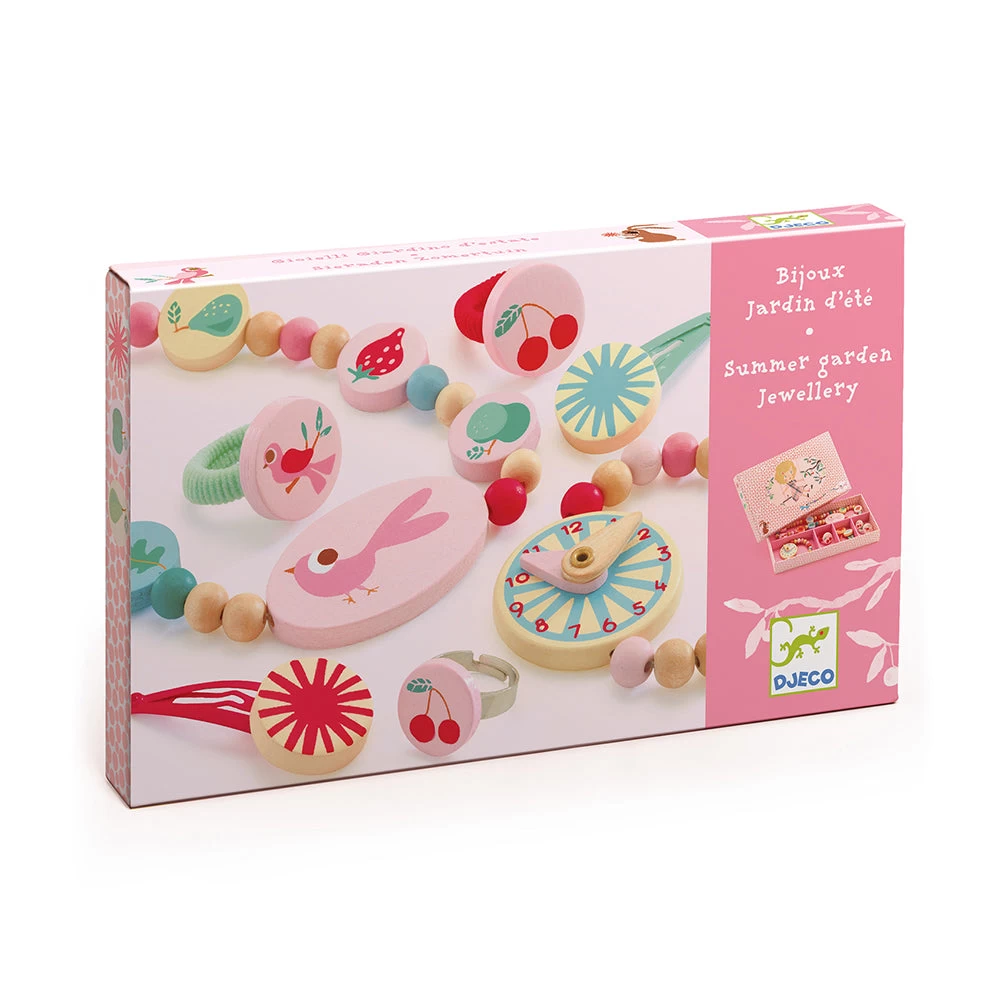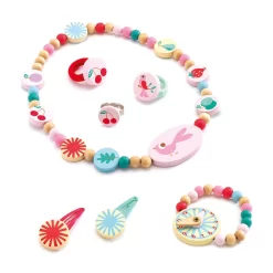 A pretty set of wooden jewellery that would make the perfect gift for a young girl. Inspired by the summer garden, the set is designed in pale pinks and blue with cherries, stylised flowers and birds. The set includes 1 x necklace, 1 x bracelet, 2 x hair clips, 2 x hair bands, 1 x ring. Skill Development: fine motor skills, storytelling and role playing, creativity and imagination, visual acuity and cognitive development, social communication.