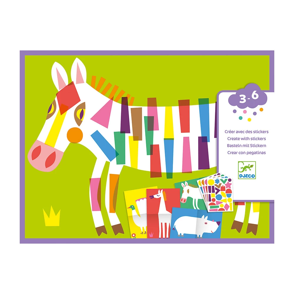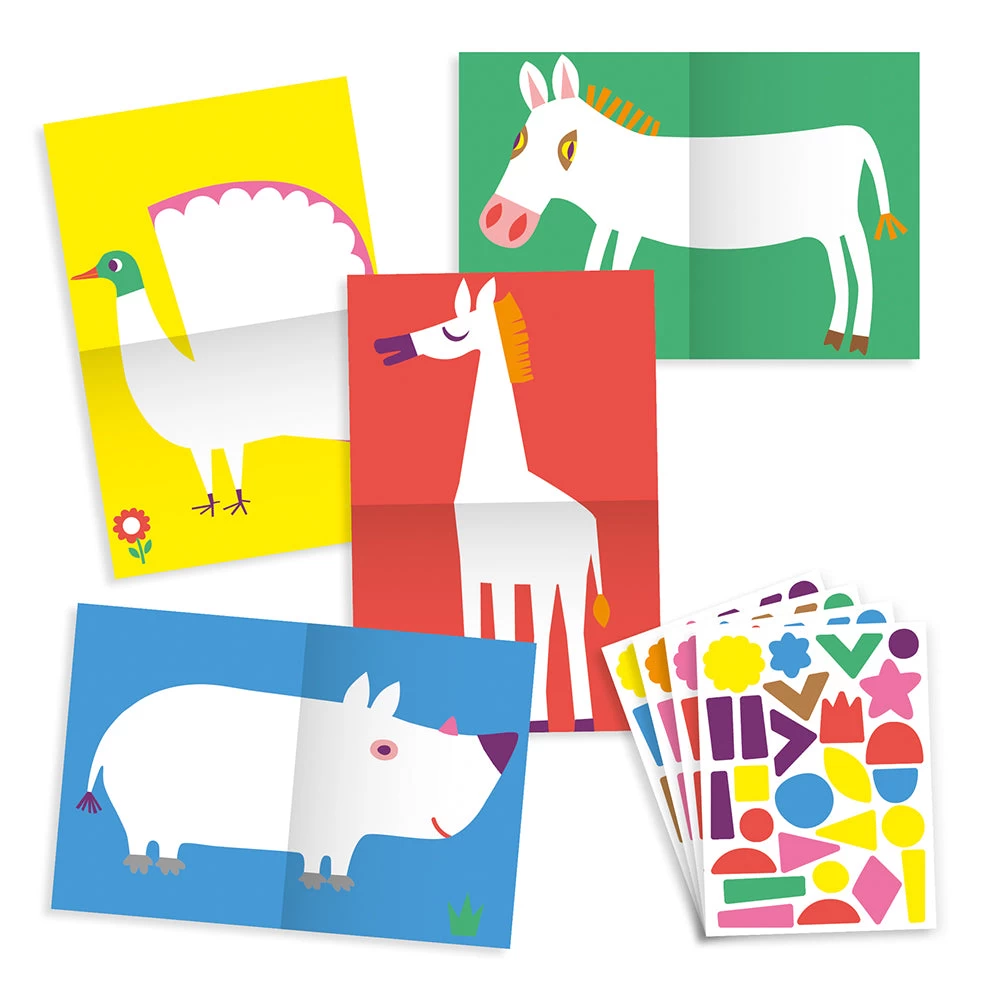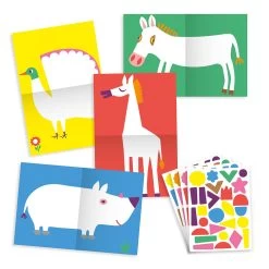 Decorate the 4 colourful animal cards with the brightly shaped stickers. Each of the 4 rectangle animal card is 42cm long, contains 108 stickers. Designed by Sophie Ledesma. Skill Development: dexterity, hand-eye coordination, art appreciation, patience and concentration, creativity and imagination