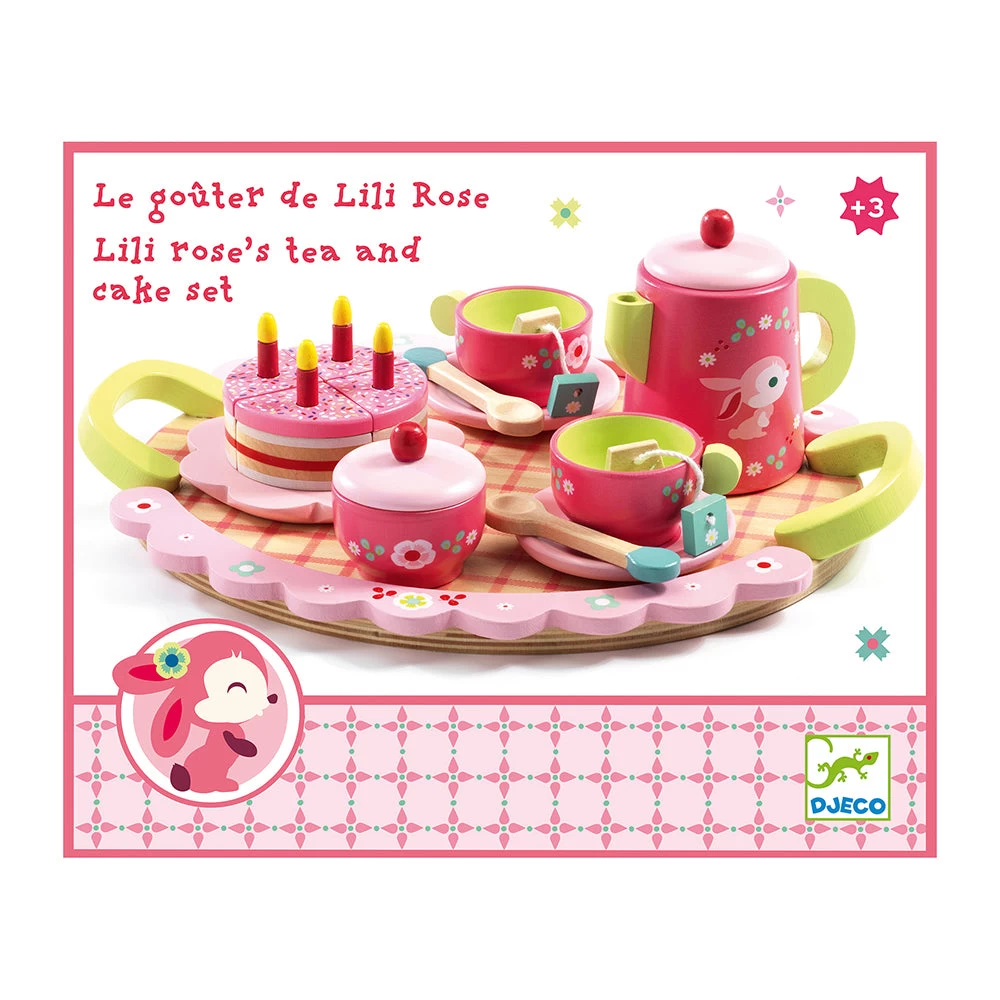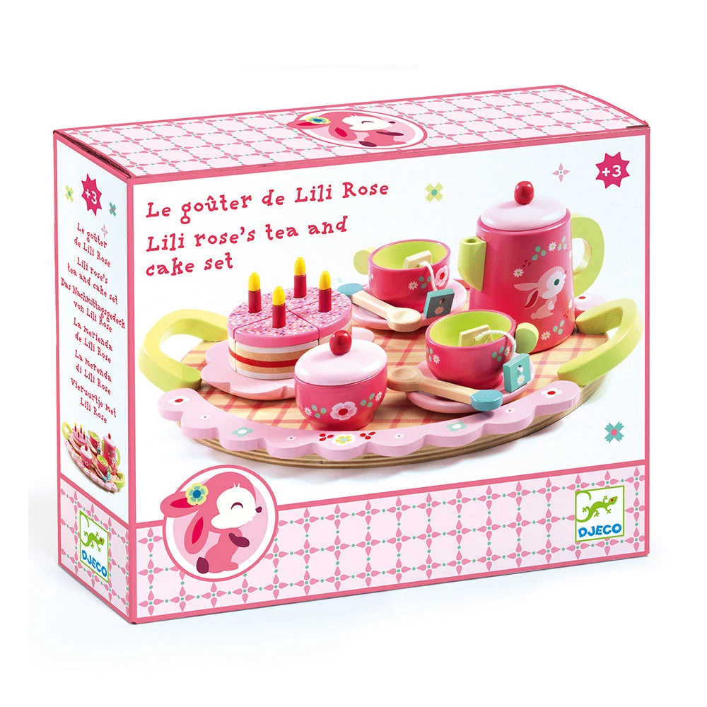 Serve up a slice of birthday cake with a pot of tea and enjoy an afternoon tea event with this adorable tea party set that includes: Wooden serving tray, teapot, 2 tea cups and saucers, sugar bowl with lid, two tea bags, two teaspoons, 1 plate, and wooden birthday cake with 4 removable candles. Skill Development: fine motor skills, storytelling and role playing, creativity and imagination, visual acuity and cognitive development, social communication.