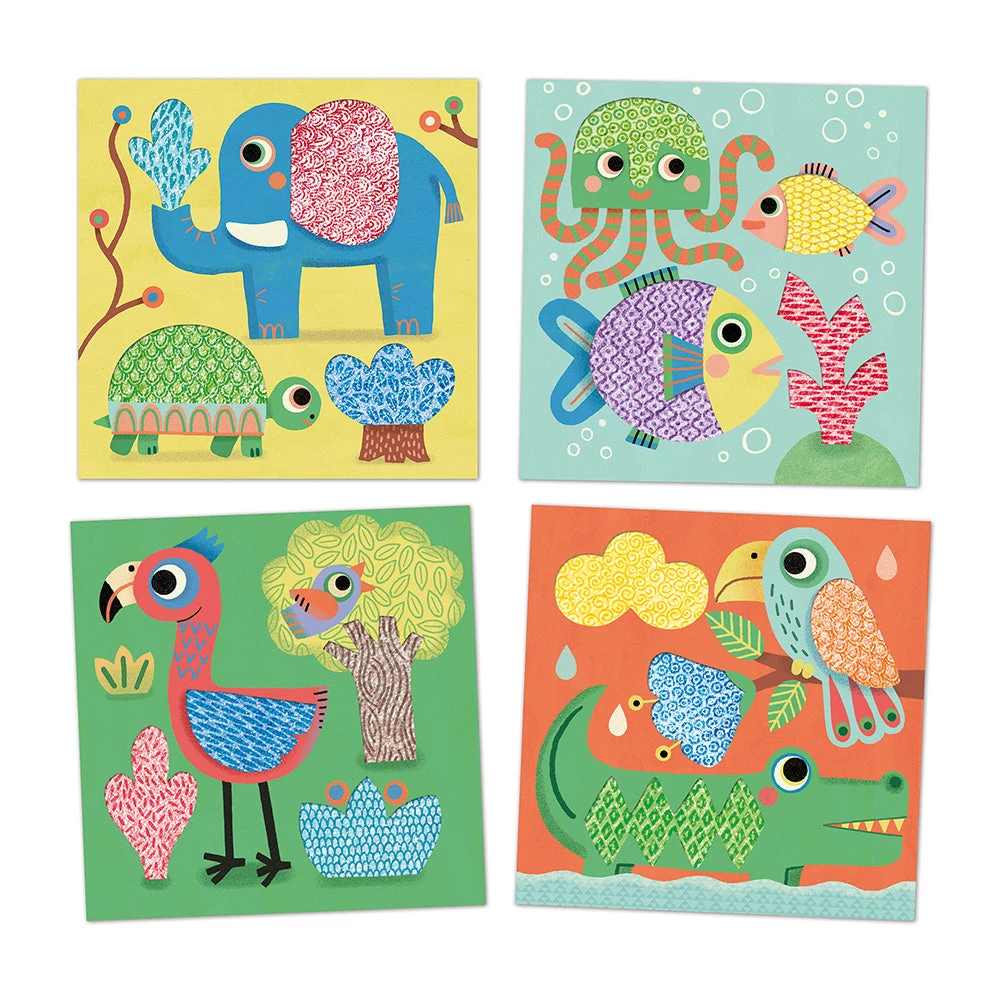A beautiful pattern rubbing activity featuring animal scenes for children to explore texture and colours. Includes 4 large easy to hold double ended wax crayons, sheets with a selection of patterns to rub and illustrated envelopes. Designed by Magali Attiogbe. Skill Development: dexterity, hand-eye coordination, sensory, patience and concentration, creativity and imagination