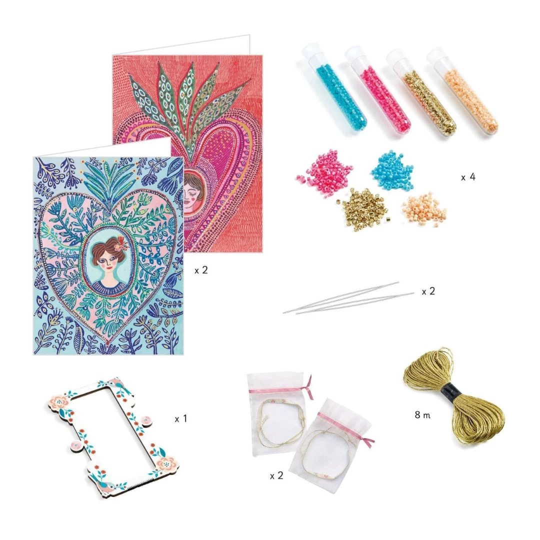 Contents: 4 bead tubes, 4 charms, 1 pair pliers, 1 loom, 2 fasteners, threads, 2 needles, 1 instruction booklet, 2 organza bags, 2 illustrated cards.