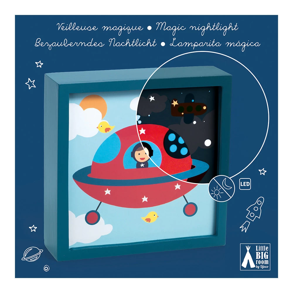 One picture by day…then when you turn on the nightlight, surprise…the picture tells a new story. This night light with an out of this world space theme emits a relaxing, soft glow. Requires 3 x AA batteries with battery saving timer. Designed by Edouard Manceau