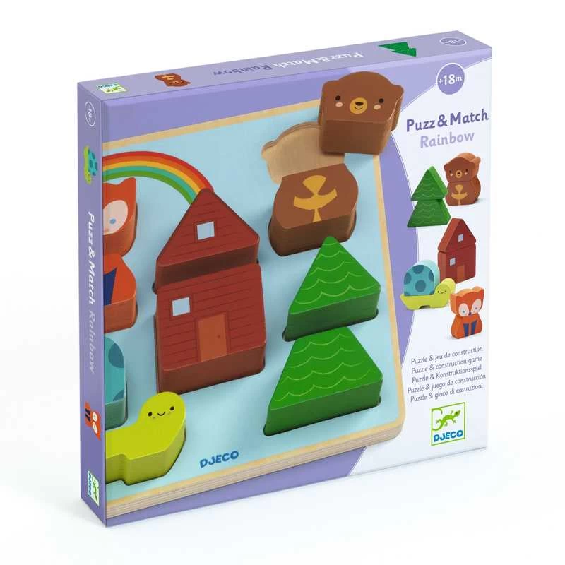 Puzz & Match Rainbow is an easy-to-assemble wooden puzzle and construction game.