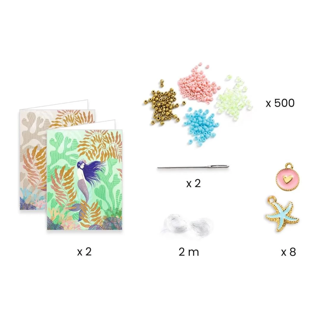 Contents: 500 beads, 8 charms, 2m of elastic thread, 2 needles, 1 instruction booklet, 2 organza bags, 2 illustrated cards.