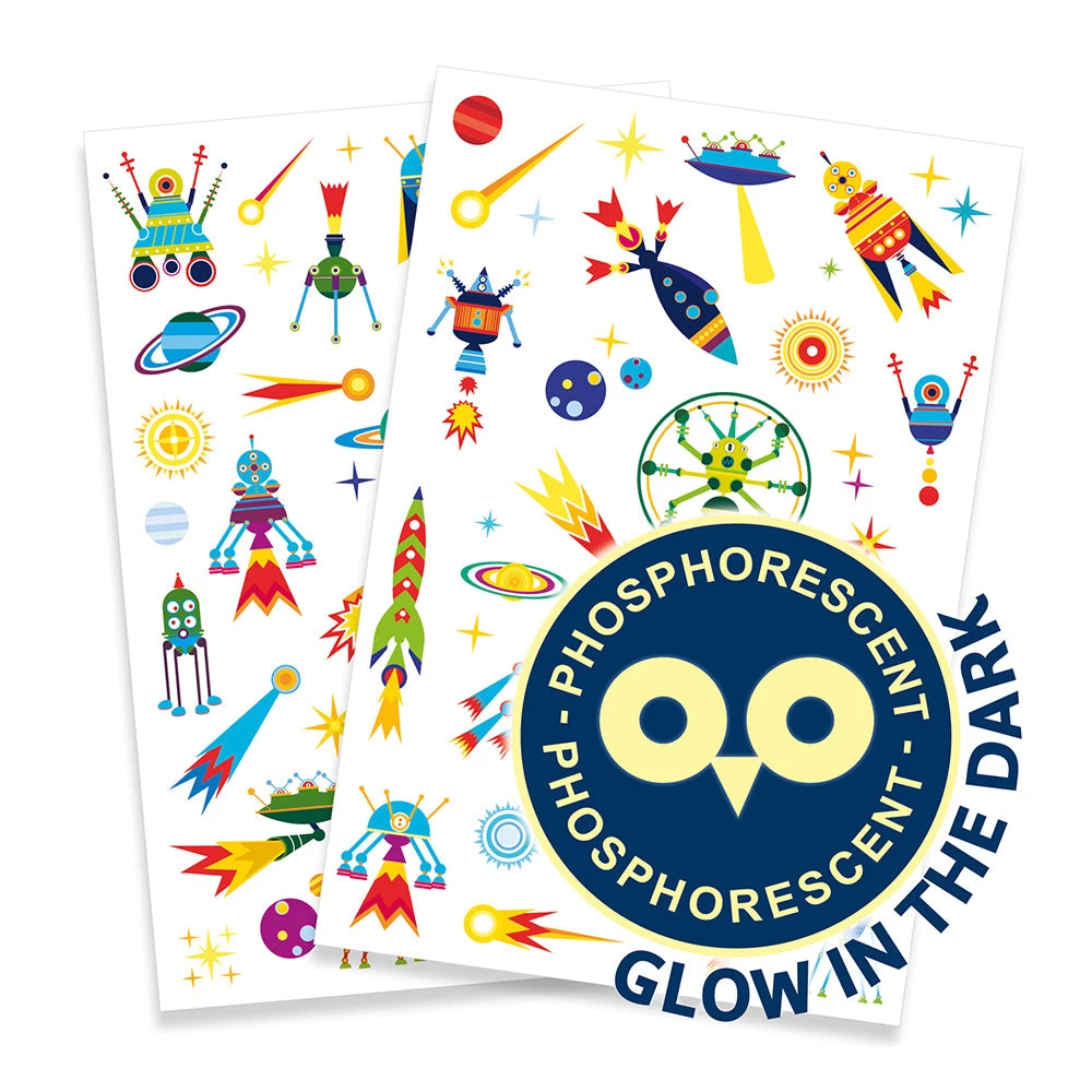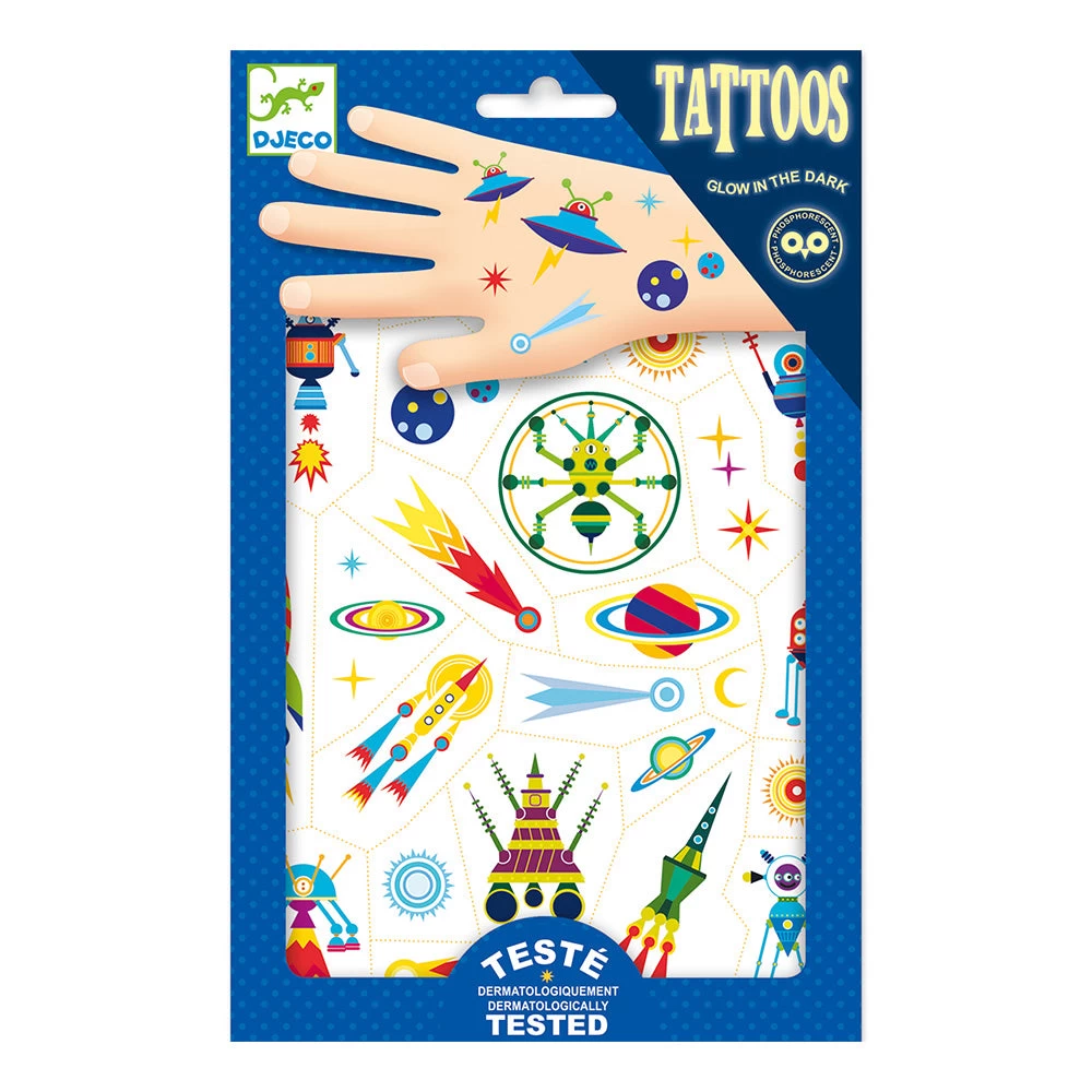 Outer Space themed temporary tattoos with glow in the dark effect.??Designed by Christian Montenegro.