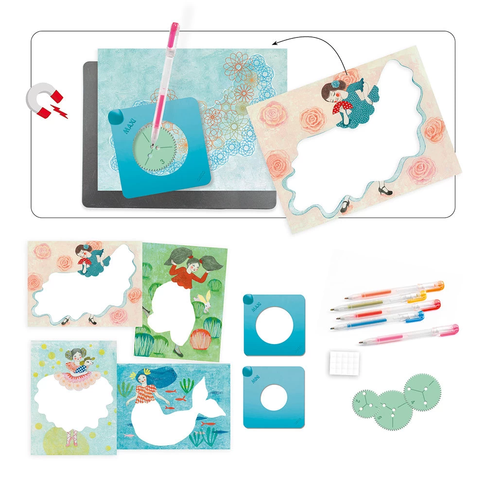 Recreating classic spiral art with a new twist, this set uses an ingenious magnetic system to hold the spiral-makers in place, creating stunning results. Place the coloured pens in the magnetic system to create beautiful spiral designs. The themes included in this set are pretty and intricate dress patterns. Skill Development: dexterity, hand-eye coordination, art appreciation, patience and concentration, creativity and imagination