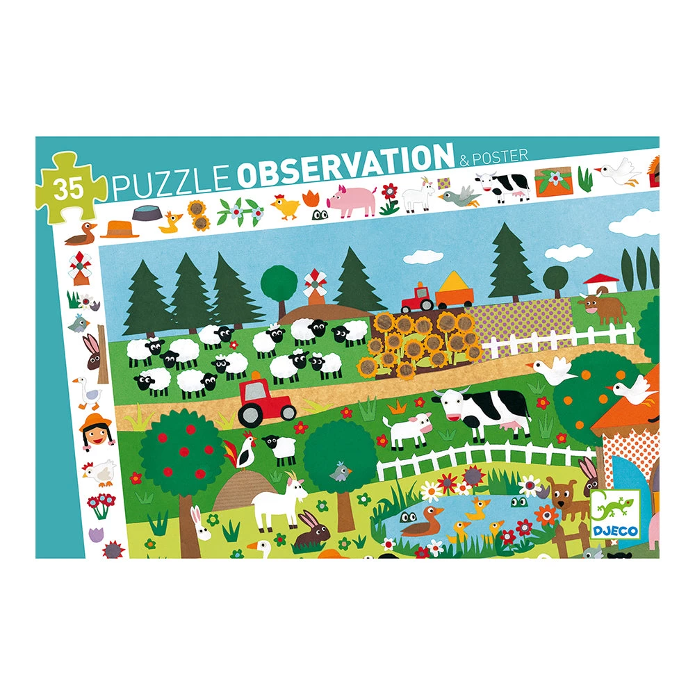 The Farm is 35 piece kids observation jigsaw of farm animals. Make the puzzle and then find the objects around the border hidden within the puzzle itself. The pack comes with a free poster. Skill Development: fine motor skills, observation skills, sequencing, problem solving skill, visual acuity and cognitive development.