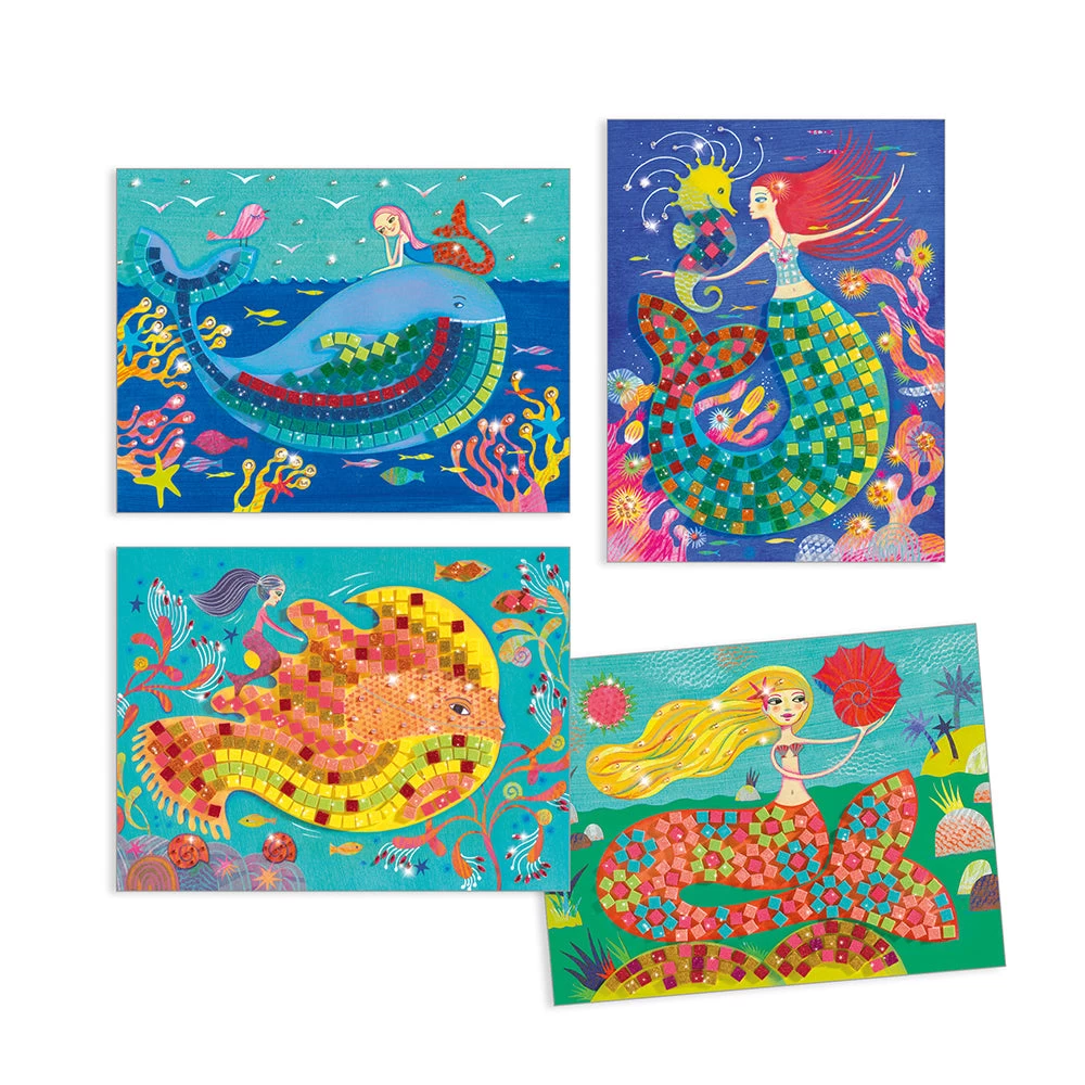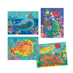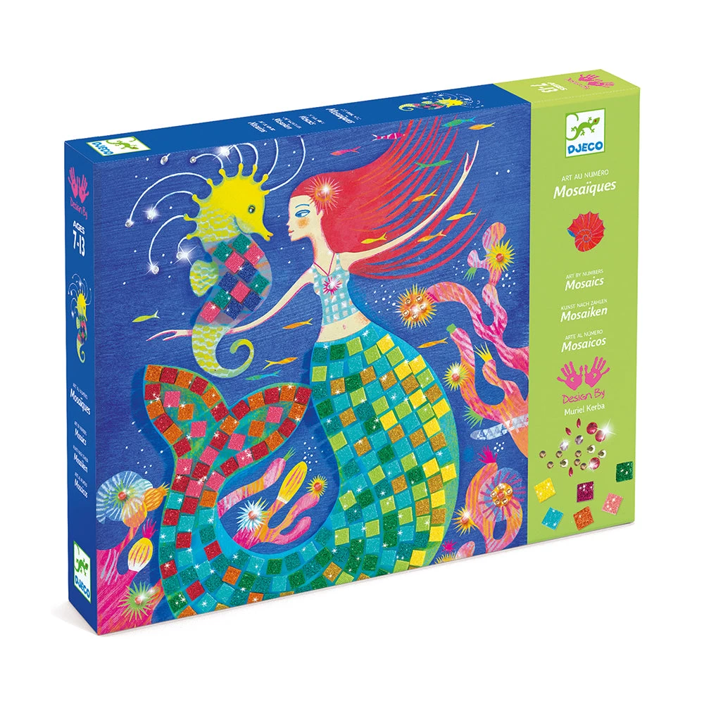 Decorate mystical mermaid illustrations with this mosaic set. Children follow the colour-code indicated on the sheets and stick on the self adhesive rhinestones and squares of glittering foam: the mermaids sparkle in the mirror of the waves. The set contains 4 pictures to complete, 16 sheets of glittering foam stickers, 4 sheets of rhinestones and full instructions. Designed by Muriel Kerba. Skill Development: dexterity, hand-eye coordination, art appreciation, patience and concentration, creativity and imagination