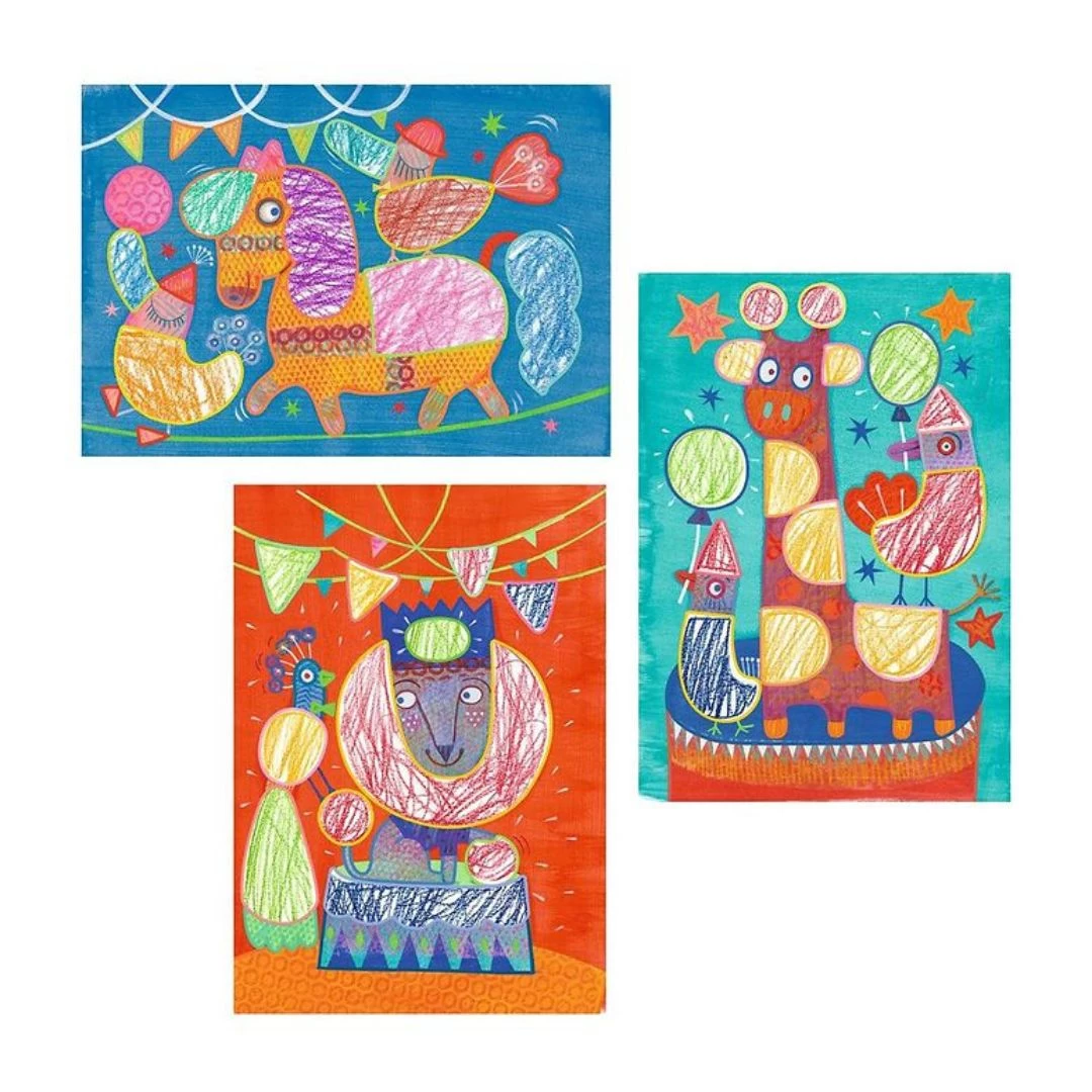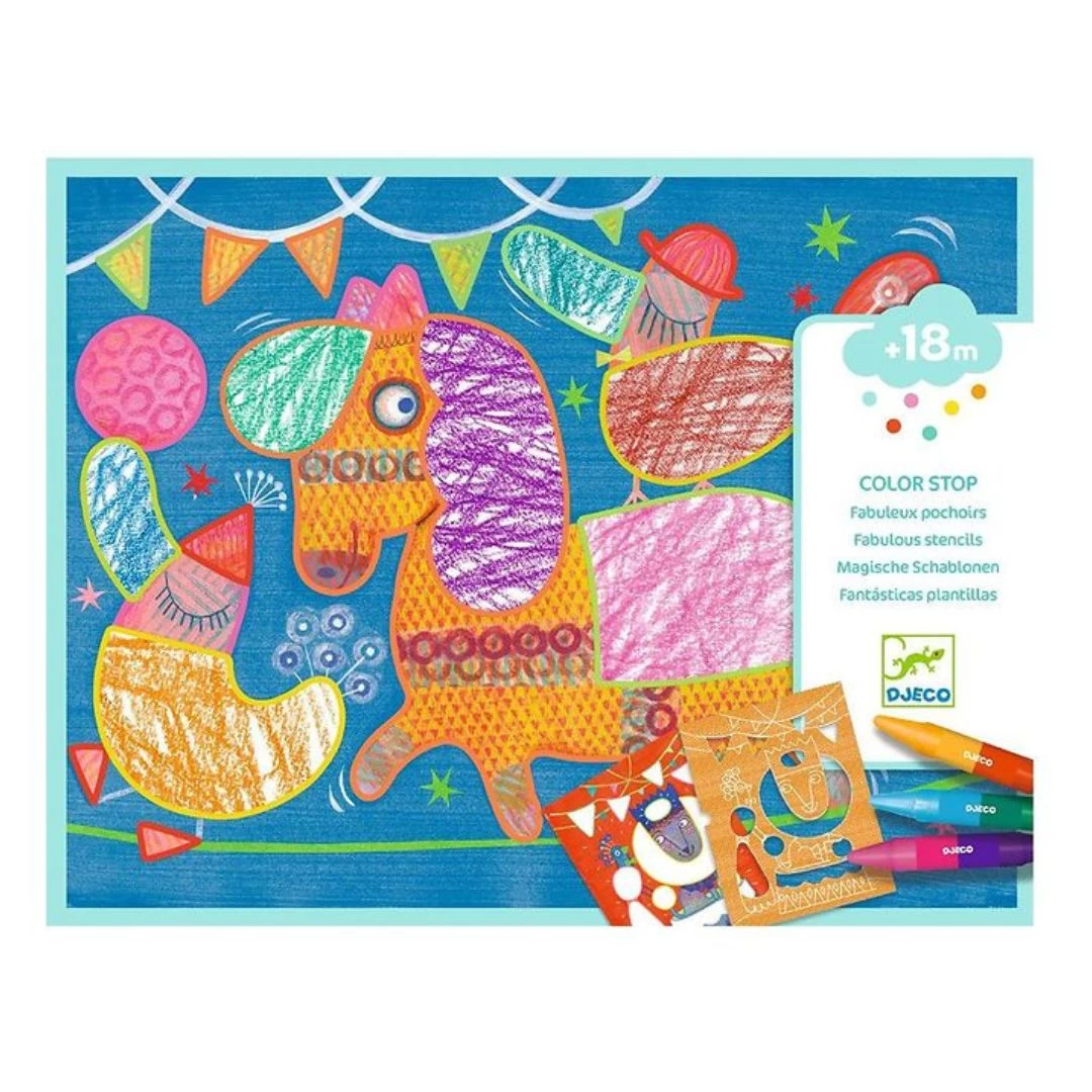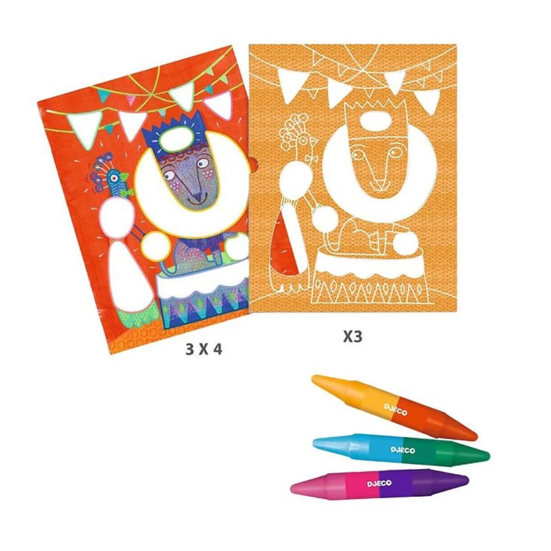 Contents: 12 illustrated cards (21 x 28 cm), 3 thick illustrated stencils, 3 double ended wax crayons and 1 step-by-step instruction booklet.