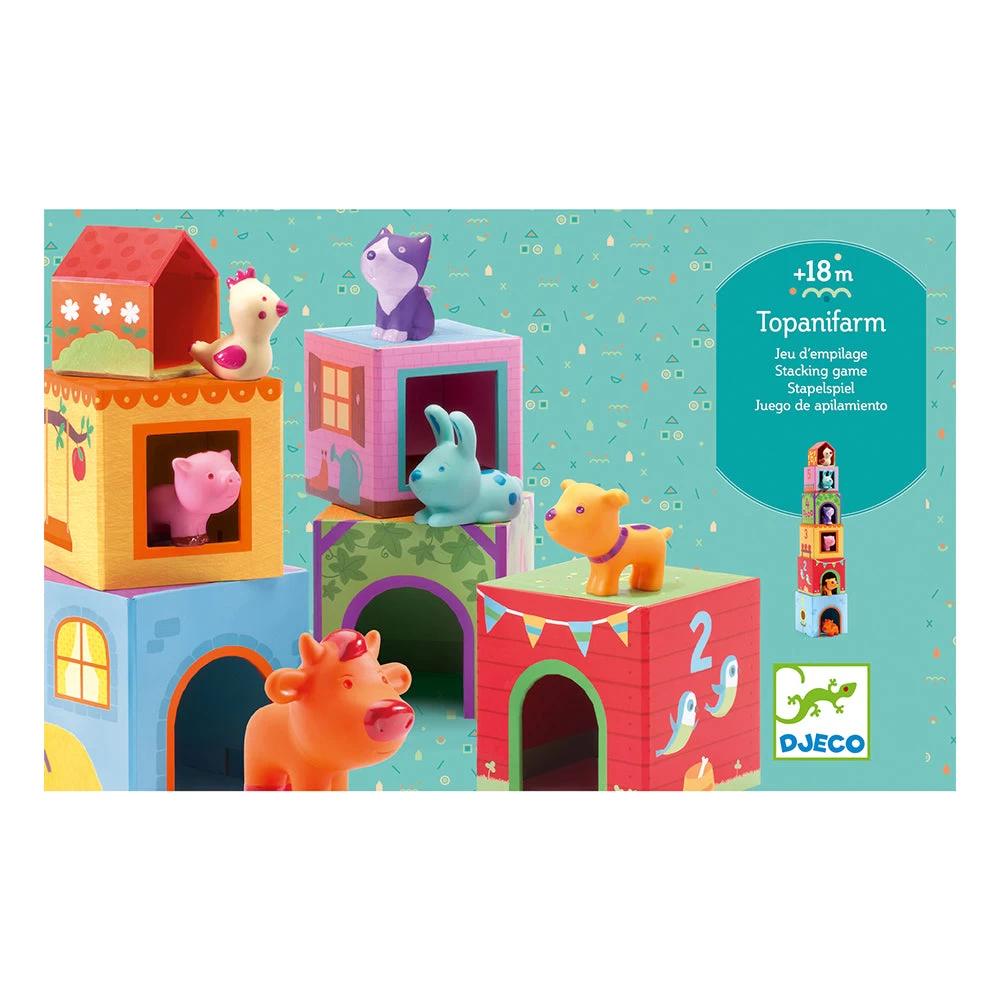 6 brightly colours farm animals with 6 stacking boxes. Stack up the boxes and put the animals in their houses or line them up in size order. Skill Development: fine motor skills, hand-eye coordination, shape recognition, counting and sequencing, cause and effect introductionl and concentration.