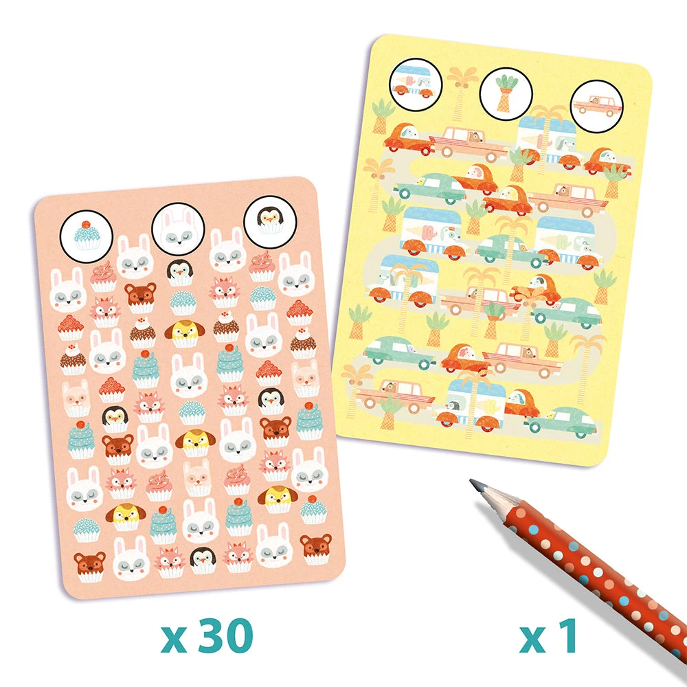 Perfect for on the go! This pack of 30 beautifully illustrated cards will keep kids entertained. Each card features adorable illustrations and 3 items to find on the card. The set also includes a pencil, all fitting in a pocket-size packet. Skill Development: observations and memory, concentration and dexterity.