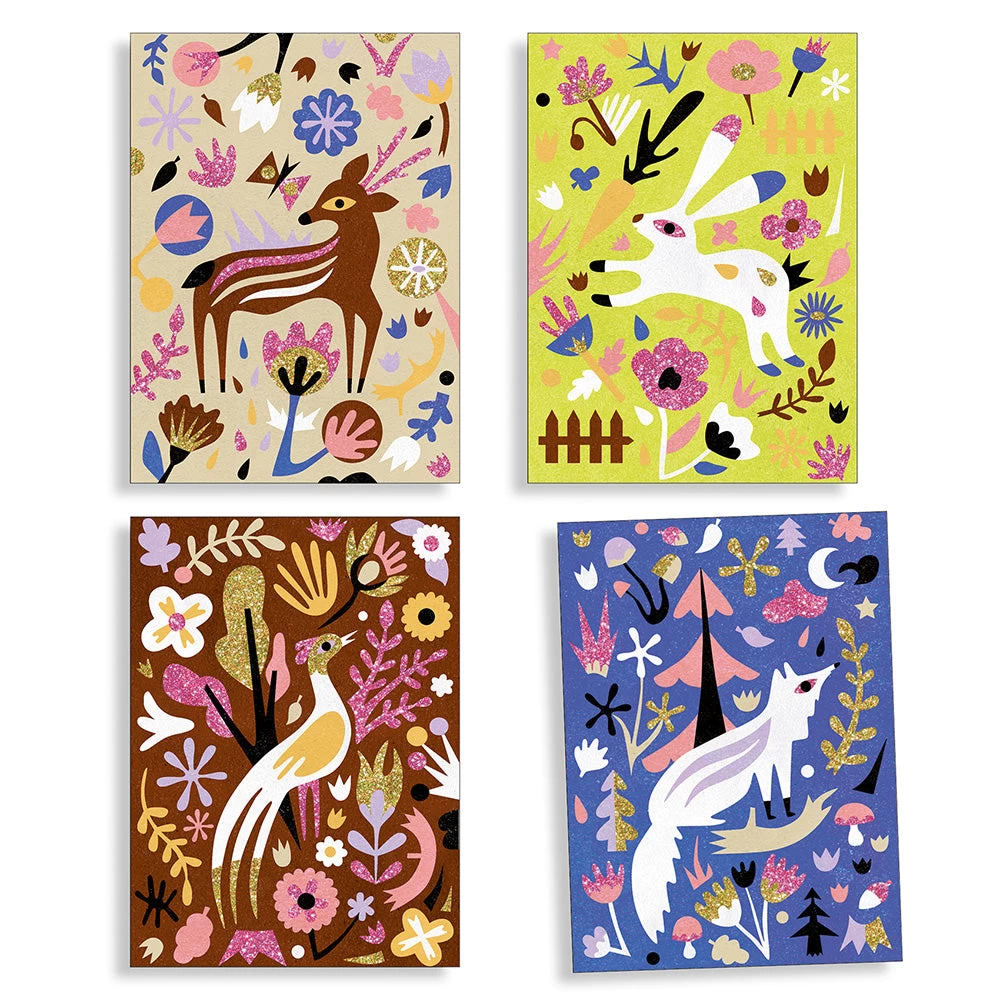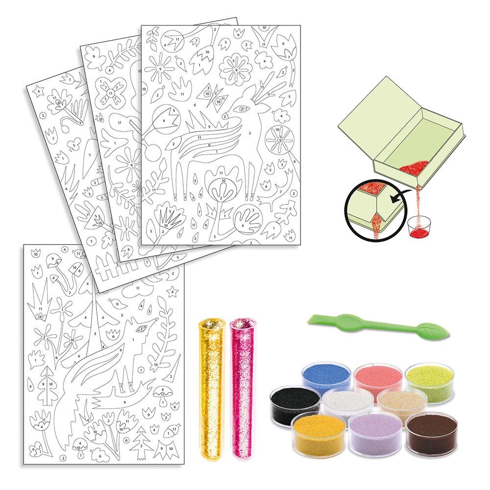 Creating woodland animals from sand and glitter in wonderful colours is fabulous fun! Just use the tool to uncover the glue coated areas then sprinkle on your sand and glitter to create beautiful pictures. Contains 4 glue coated cards, 9 x coloured sands, 2 x glitter tubes, 1 x tool and a step by step guide. Design by Sarah Andreacchio. Skill Development: dexterity, hand-eye coordination, art appreciation, patience and concentration, creativity and imagination