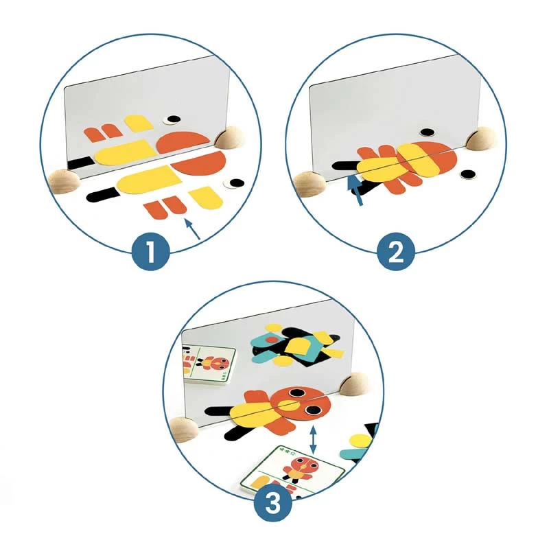Children reproduce the funny faces that are on the example cards by sliding and superimposing the paper shapes under the mirror. Everything is transformed and images appear as if by magic!