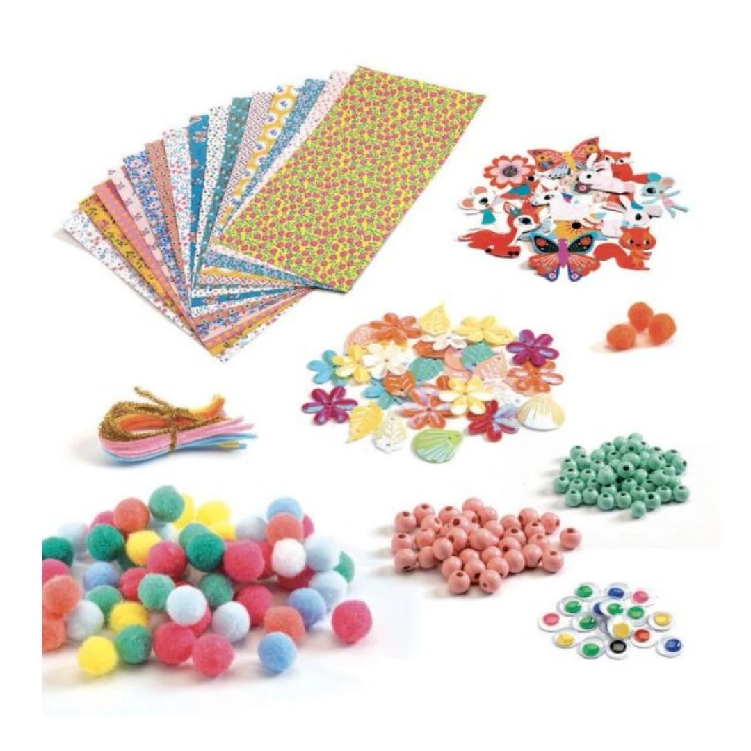 A profusion of supplies in a large 2-storey box (beads, pompoms, googly eyes, stickers, gemstones, chenille stems and more) for hours of creating. It’s all in the box, even the ideas. • A profusion of supplies for various activities (collage, assembly and cutting).