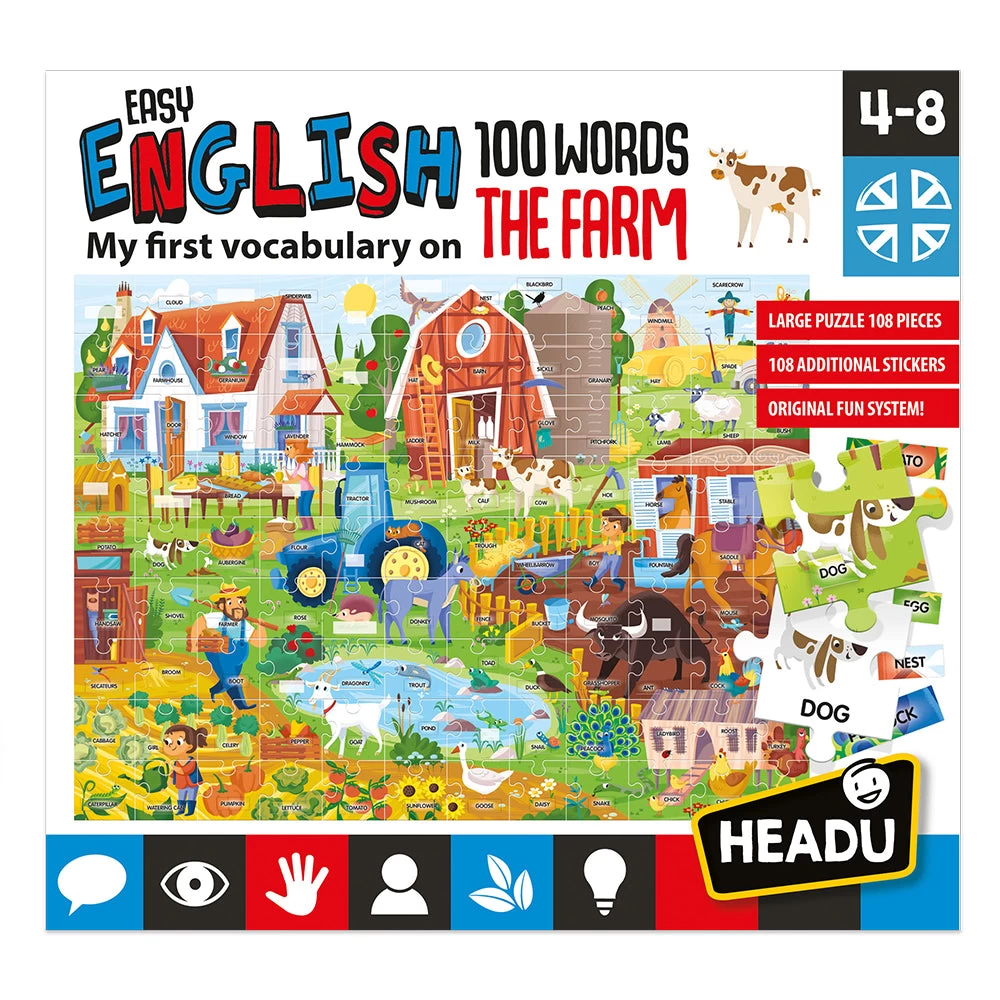 My first farm vocabulary. A large puzzle with special tokens for learning English from a very young age. Realised with resistant materials, this kit also contains more than 100 adhesives that can be attached and removed. The dedicated app helps children to learn correct pronunciation. Skill development: acquire a correct pronunciation, extend vocabulary, develop fine manual skills