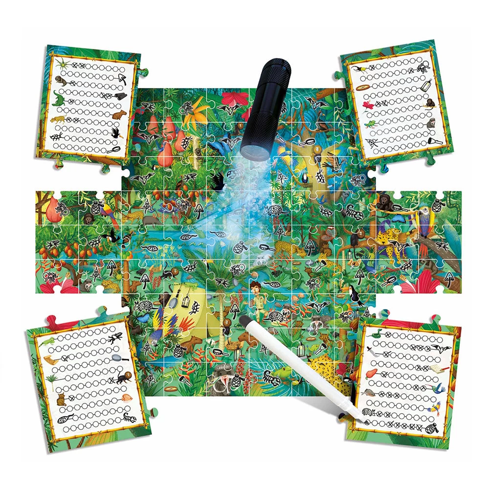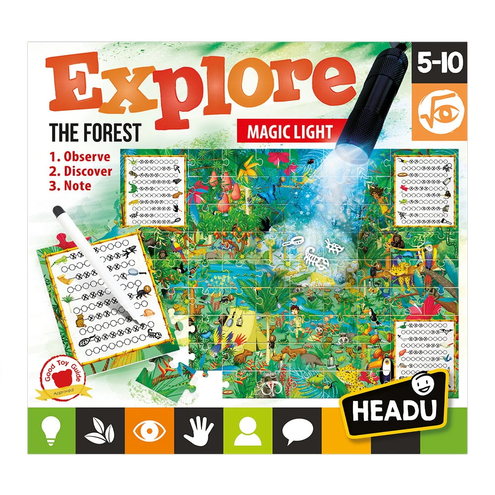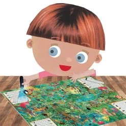Assemble the puzzle, then carefully observe the illustration and discover the subjects in the forest. Like a real scientist note the individual discoveries in your notebook. In addition, by using the magic torch you can also observe what cannot be seen by the naked eye. Skill development: scientific method, visual method, become familiar with a natural environment, classification, fine manual skills.
