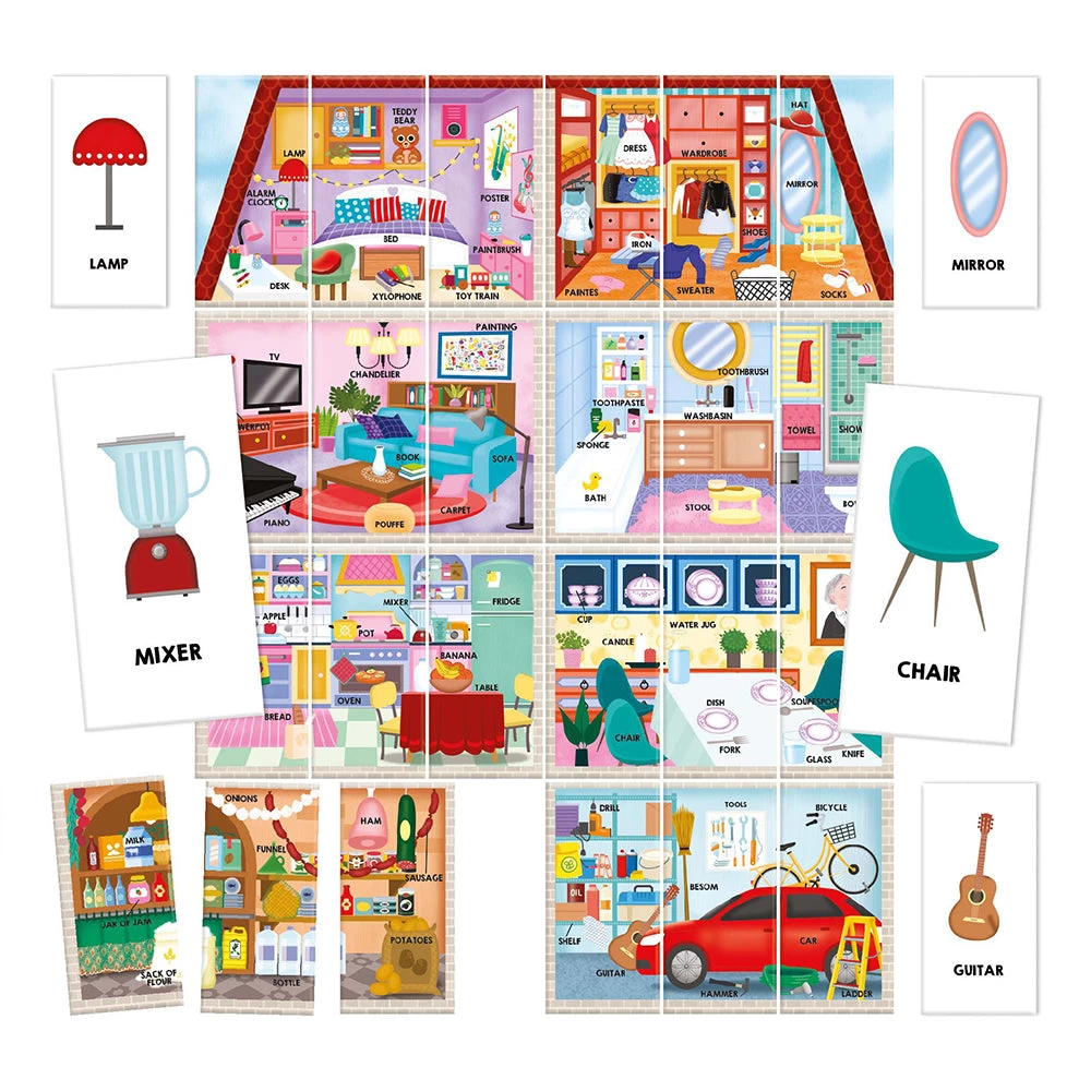 Observe, read and learn many new words in English! Have fun reassembling the big house and find all the subjects featured on the cards. Listen to the correct pronunciation of each word on the multimedia app. Skill developement: recognize words in a second language, learn new words in English, acquire correct pronunciation.