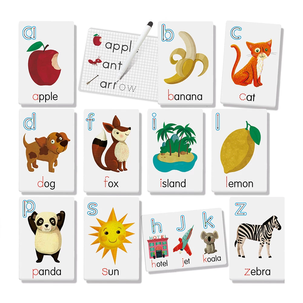 First experiences with reading and writing on these large whiteboards! On one side they see the phonemes and match them to the first letter of the word; on the other, they practice writing, tracing the words using the dry wipe pen. Skill development: writing first words, reading first words, fine motor skills.