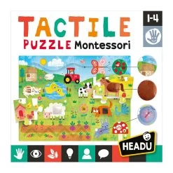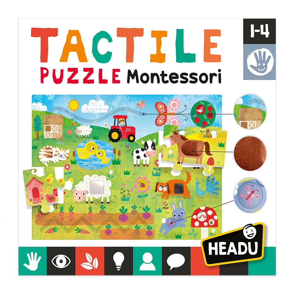 A farm puzzle with large pieces and lots of tactile areas to explore. Once they have completed the puzzle, children will love touching the special textured tiles. Skill development: tactile sensitivity, fine dexterity, sensory coordination.