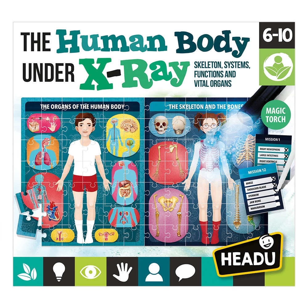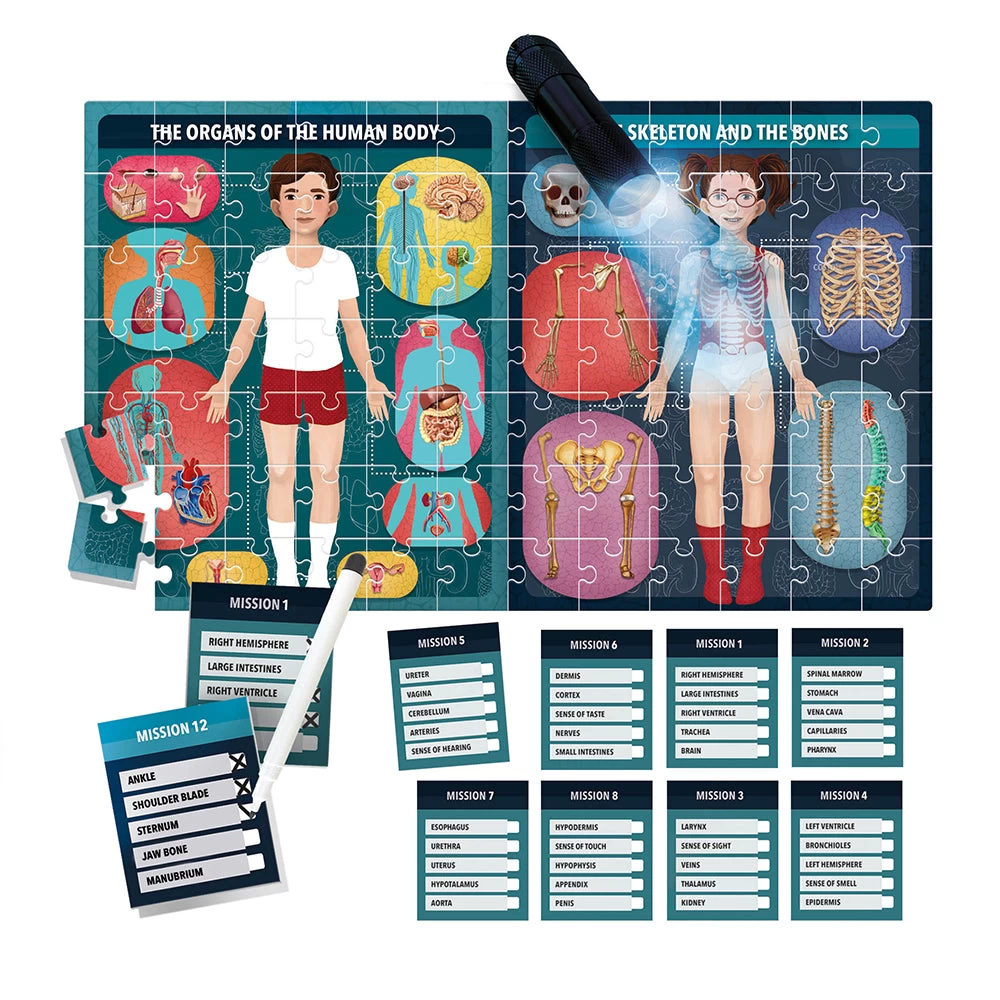 Skeleton, systems, functions and vital organs! Assemble the large puzzle and learn about the fascinating features of the human body. You can also complete missions and observe what can??t beseen with the naked eye using the magic torch! Skills development: knowledge on the human body, vital functions and organs, bbservation and the scientific method, visual memory, attention and concentration.