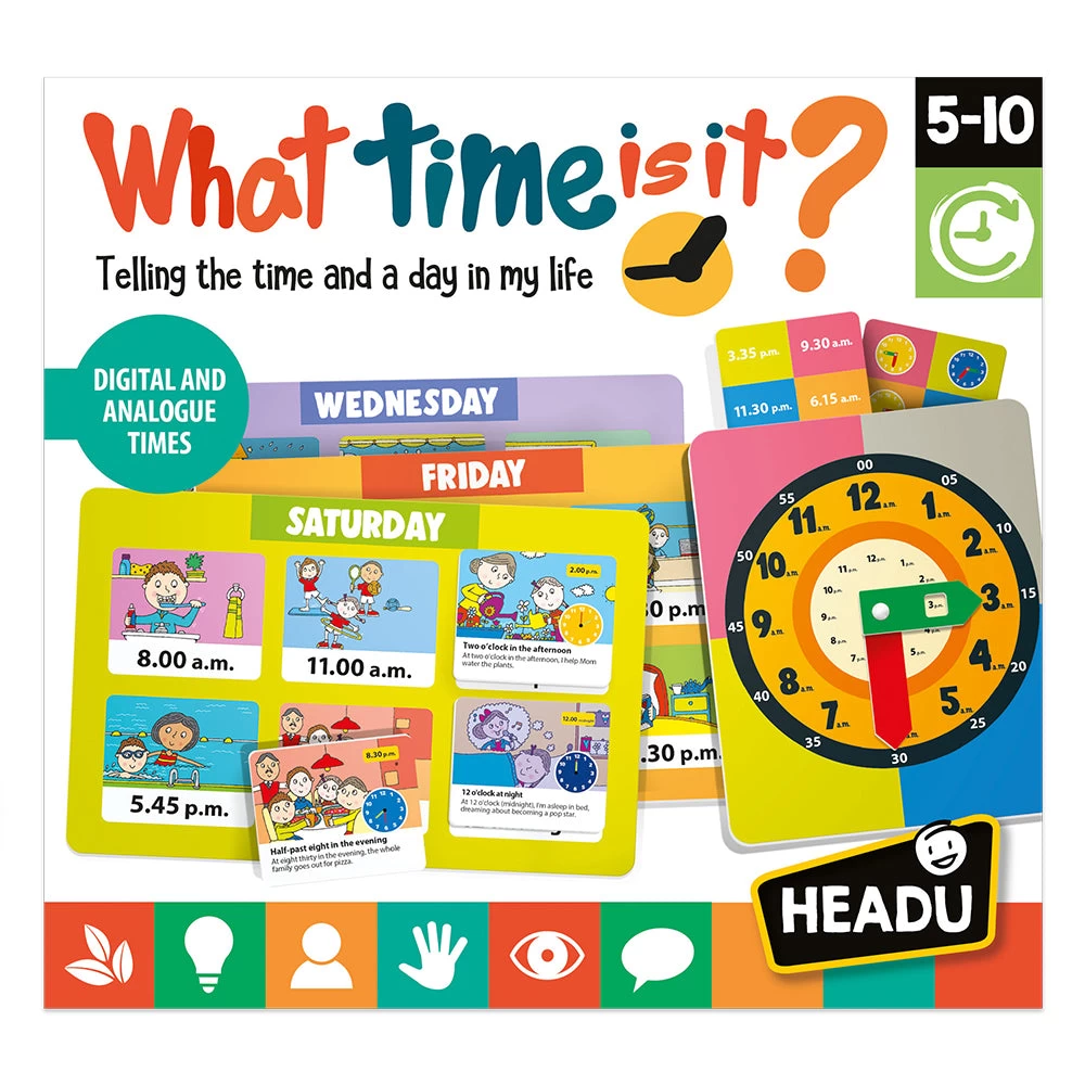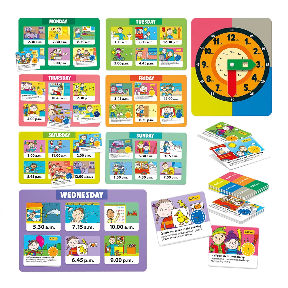 The clock and my day Time: it is four in the afternoon and time to play this fun bingo game. Featuring actions and the days of the week, children can practise reading and talking about the time in hours and minutes using analogue clocks, digital clocks, and other conventional ways! Skill development: digital and analog time, days and the week, concept of recurring events.