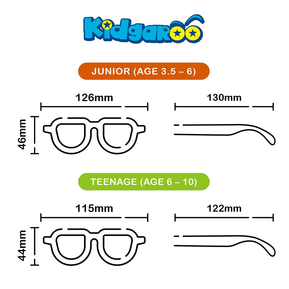 Glasses come in 2 sizes suitable for kids at 3.5-6 years (Junior) & 6-10 years (Teen).