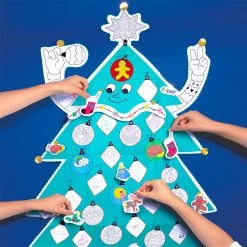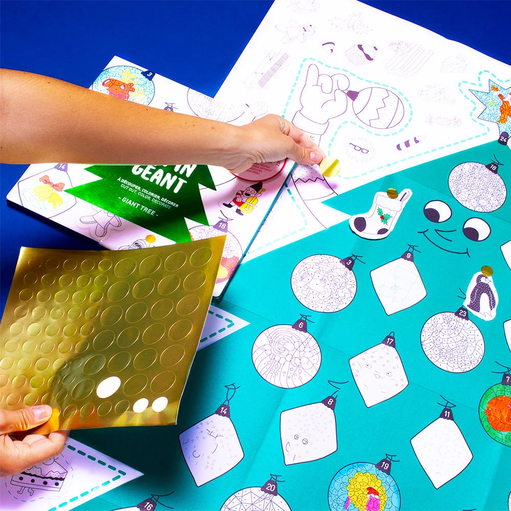 Giant poster of a Christmas tree to color, decorate and cut out…includes a sticker sheet of ornaments for more fun.