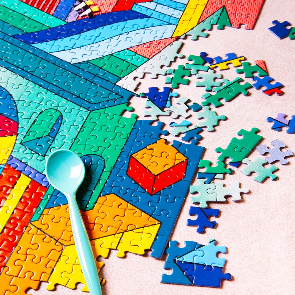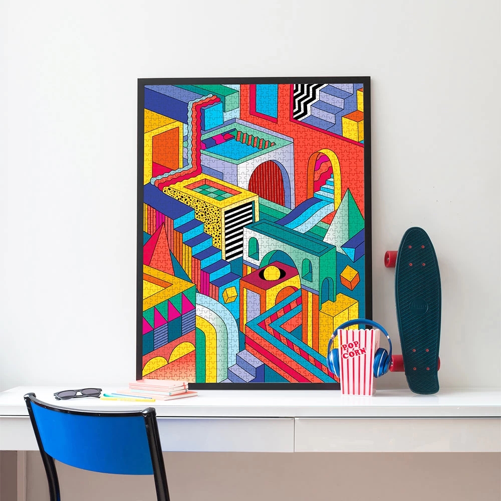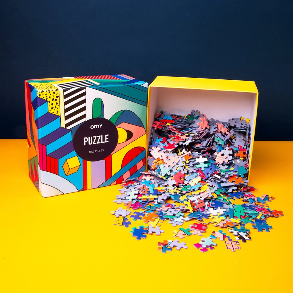 A puzzle of 1000 pieces that invites you to dive into the vibrant colors of a graphic architecture, the cube box puzzle is a great gift for good times! A graphic puzzle collection designed for bigger ones.