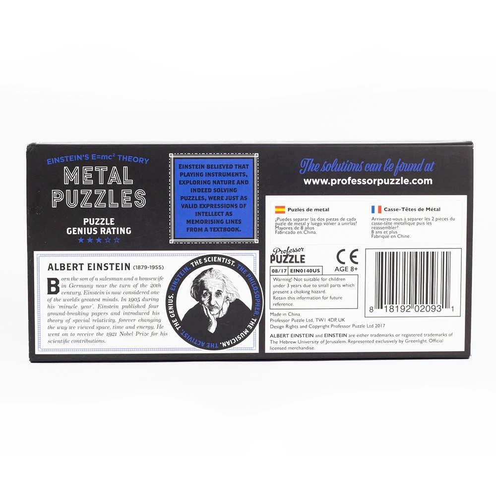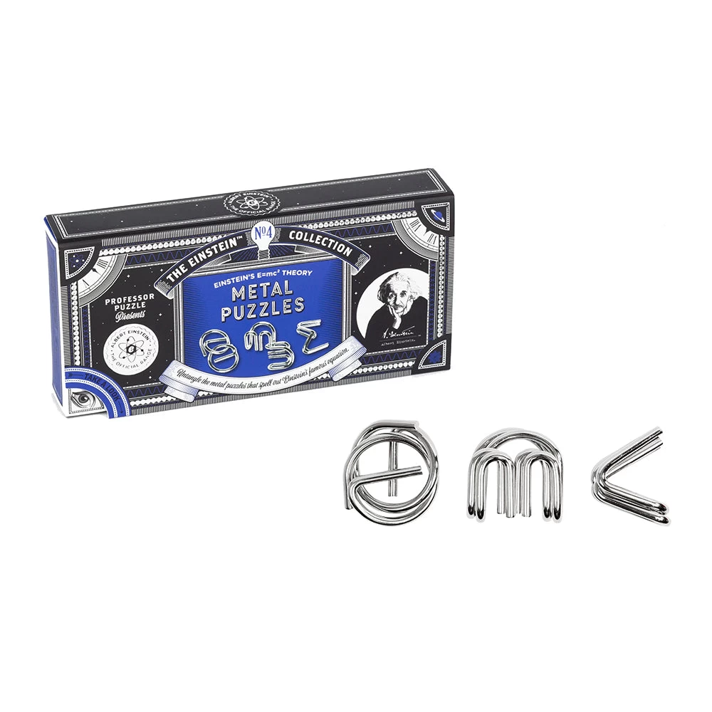 Formed of the symbols of Einsteins ground-breaking E=mc2 equation, see if you can separate the two pieces of each metal puzzle and then reattach them.