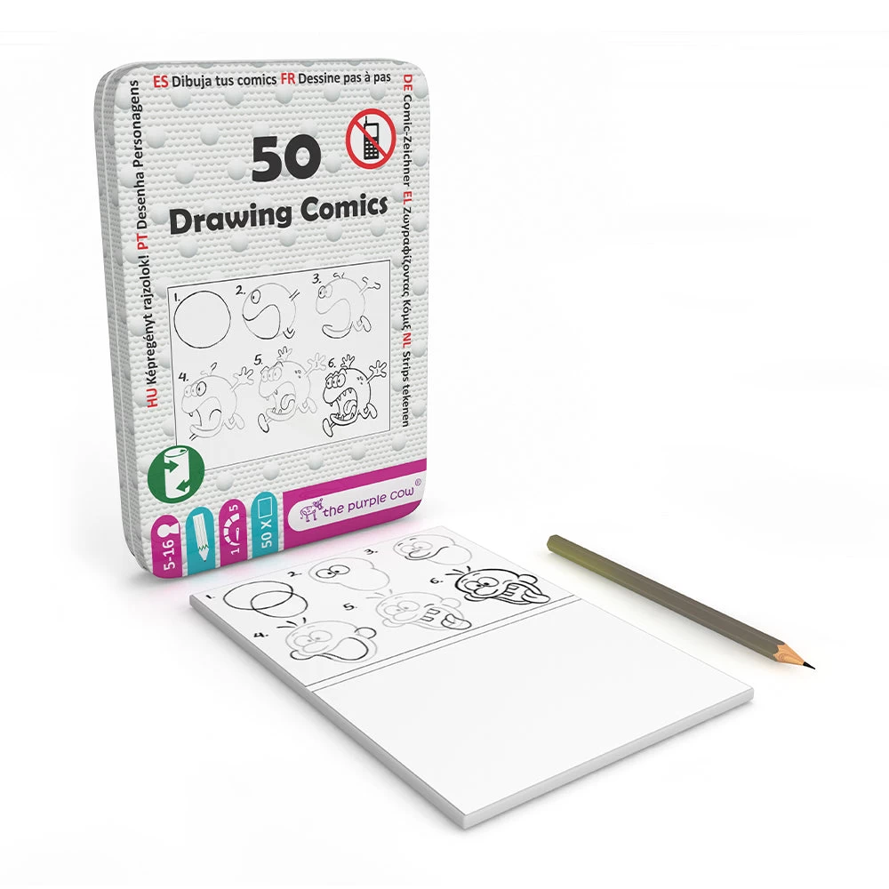 A fun and easy way to learn the basics of comic drawing on the go. Children will easily grasp the skill and of drawing comics. Joyful illustrations are made by the renowned Dutch cartoonist Tim van de Vall. The set included a pencil and a pad of 50 pages of Drawing Comics lessons inside a tin. The 50 series is designed specially for travel and give your kids an alternative activity away from screens.