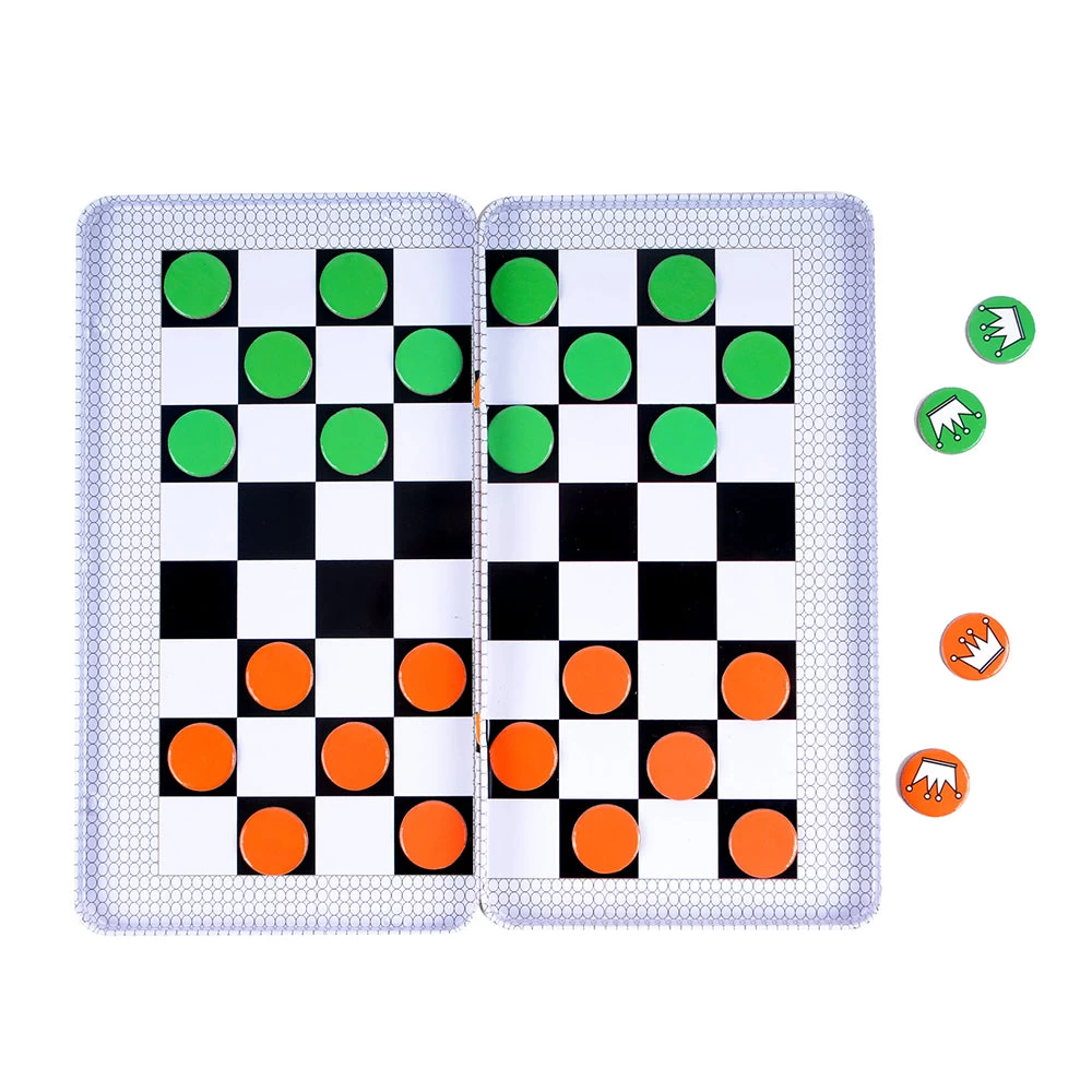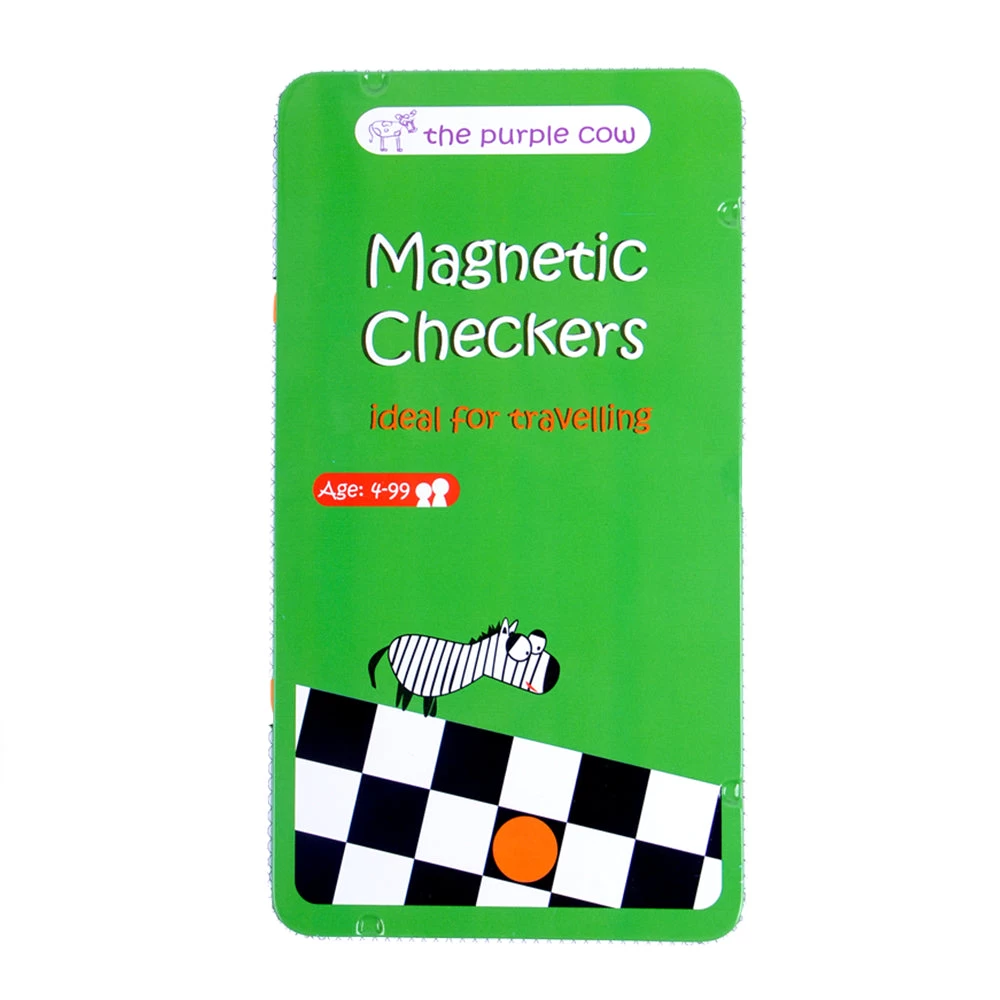 The classic Checkers game on the move. The Purple Cow Magnetic Travel Game set is designed as a fun and compact travel game set for adults and kids. Whether you are at home, in a car, between classes or hanging out with friends – pull out the board game and get ready for hours of fun. This mini, travel size, magnetic board game contains everything you need in a single set, to play on the go- magnetic game pieces, a tin case that opens to become the game board itself and the game instructions printed right on the back of the case so you will never lose them.